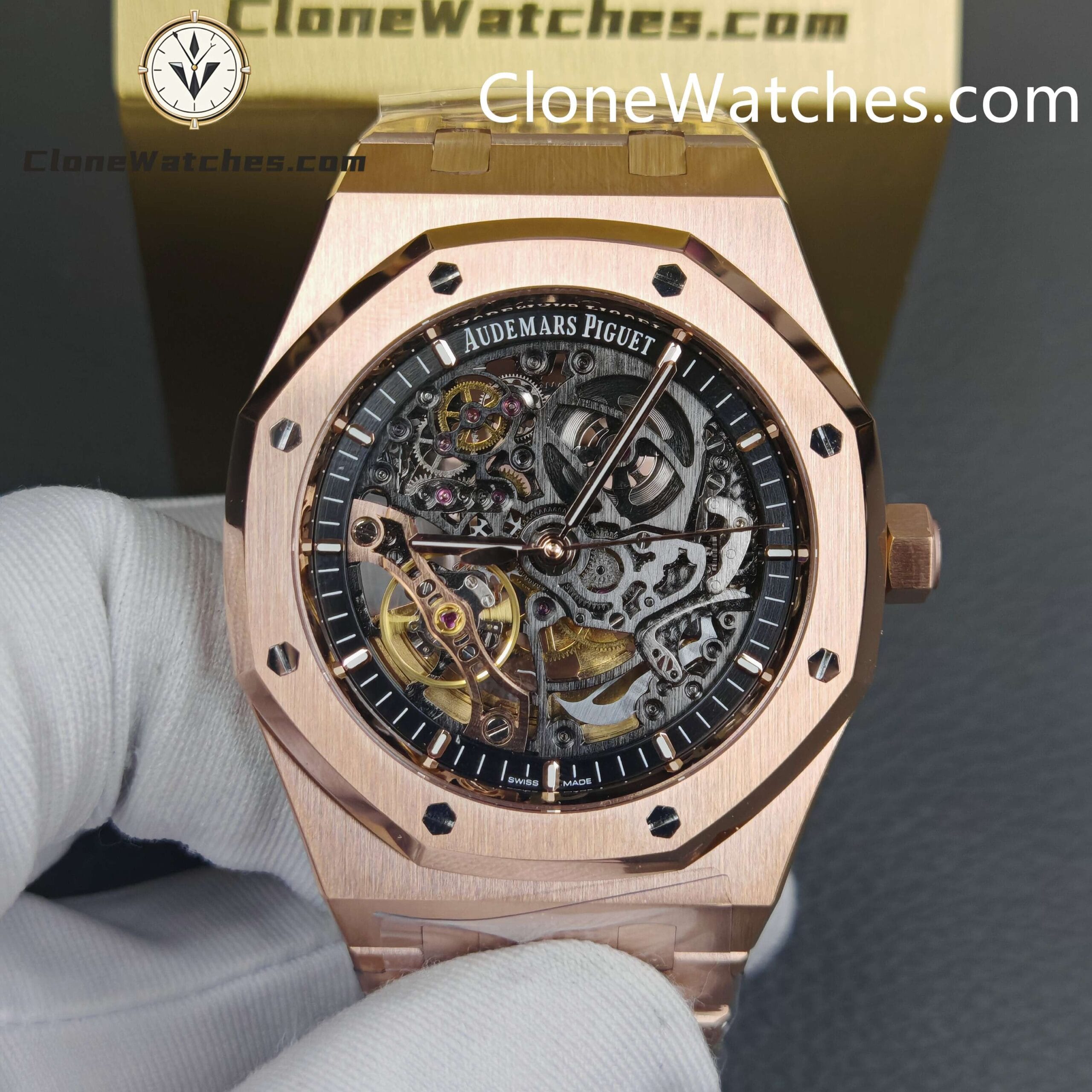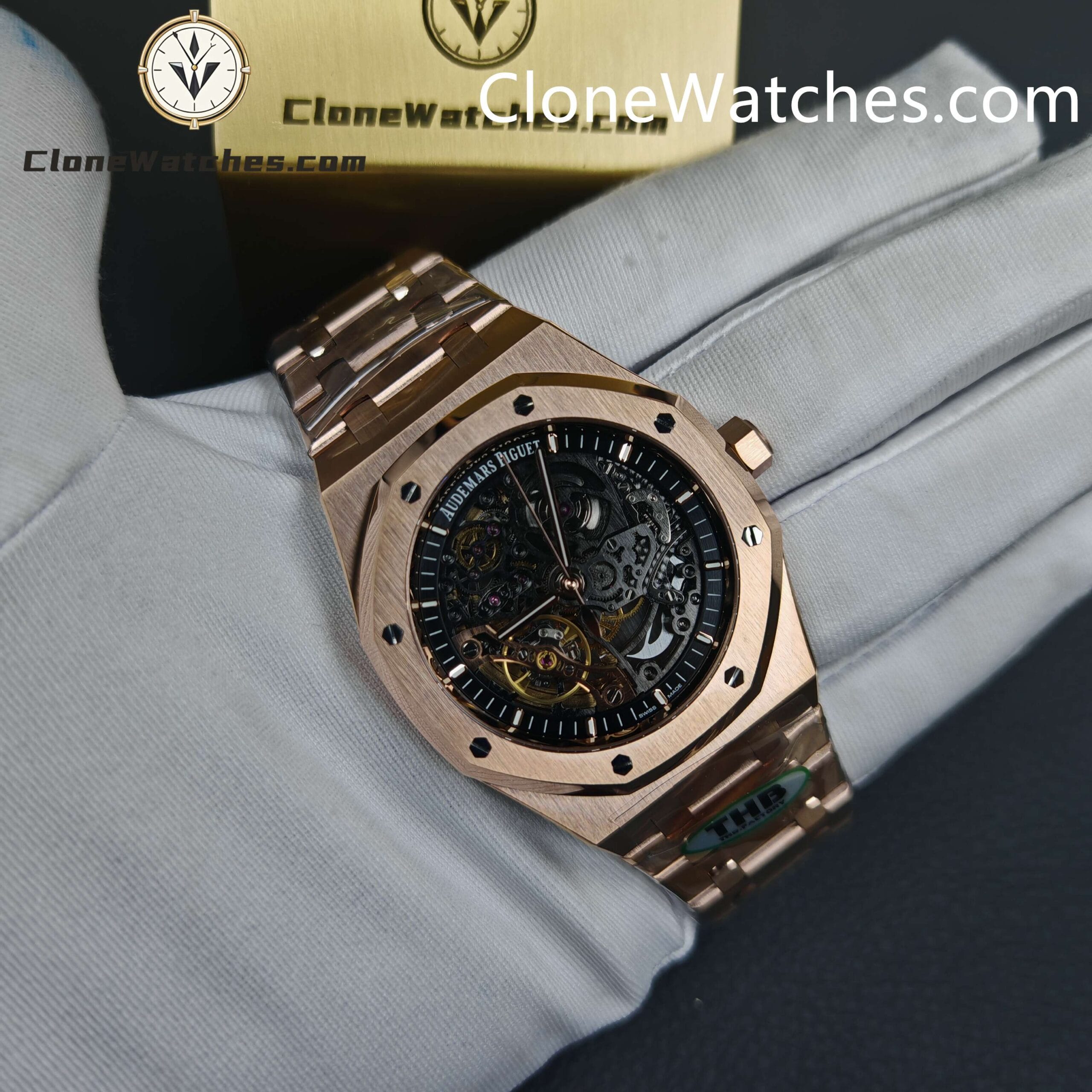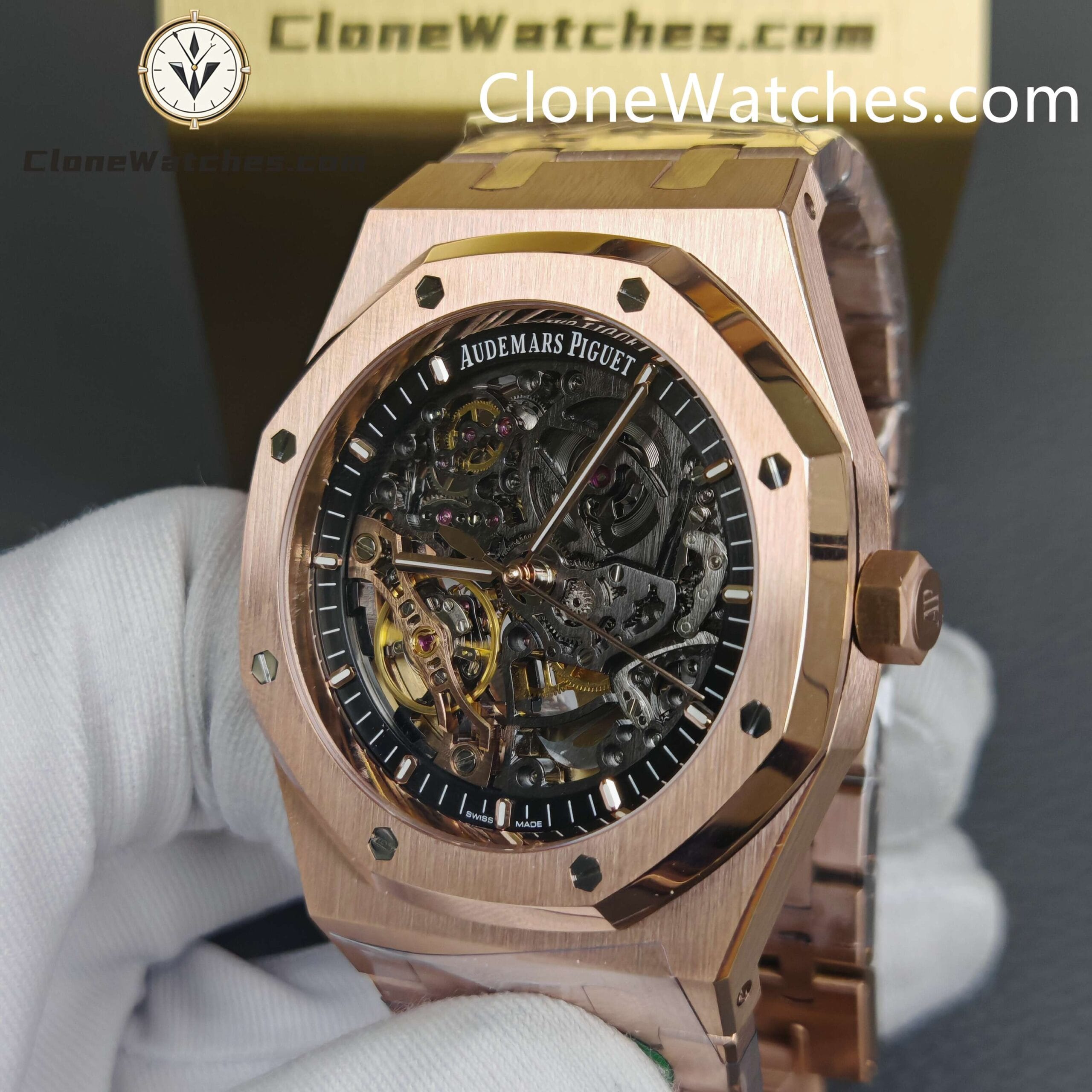 The dark gray dial features a round shape and hollow design, adding a refined element to the watch. The rose gold fluorescent three-dimensional hour markers and Royal Oak hands bring a luxurious touch. Clone Watches are protected by anti-glare sapphire crystal glass to ensure clarity and durability.
