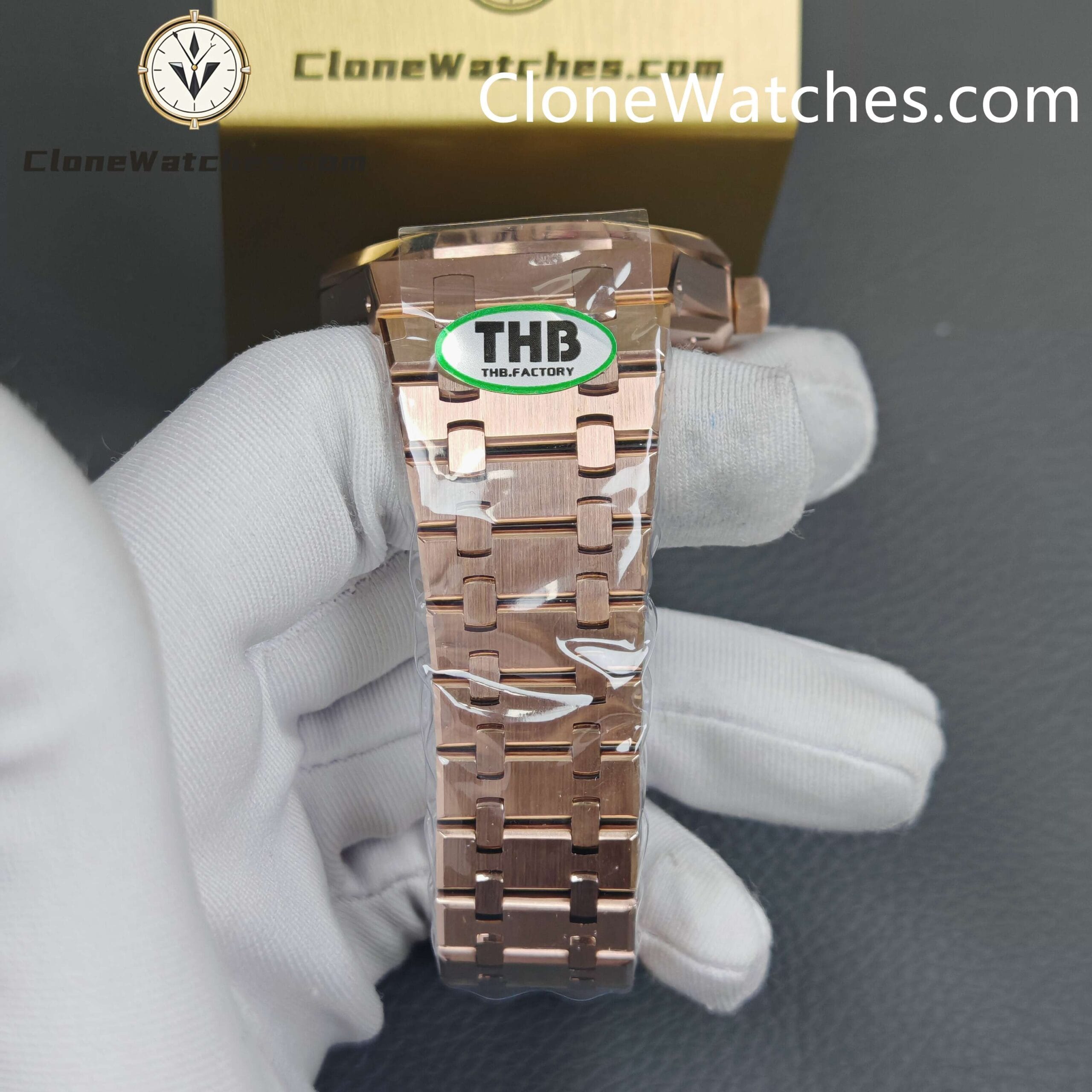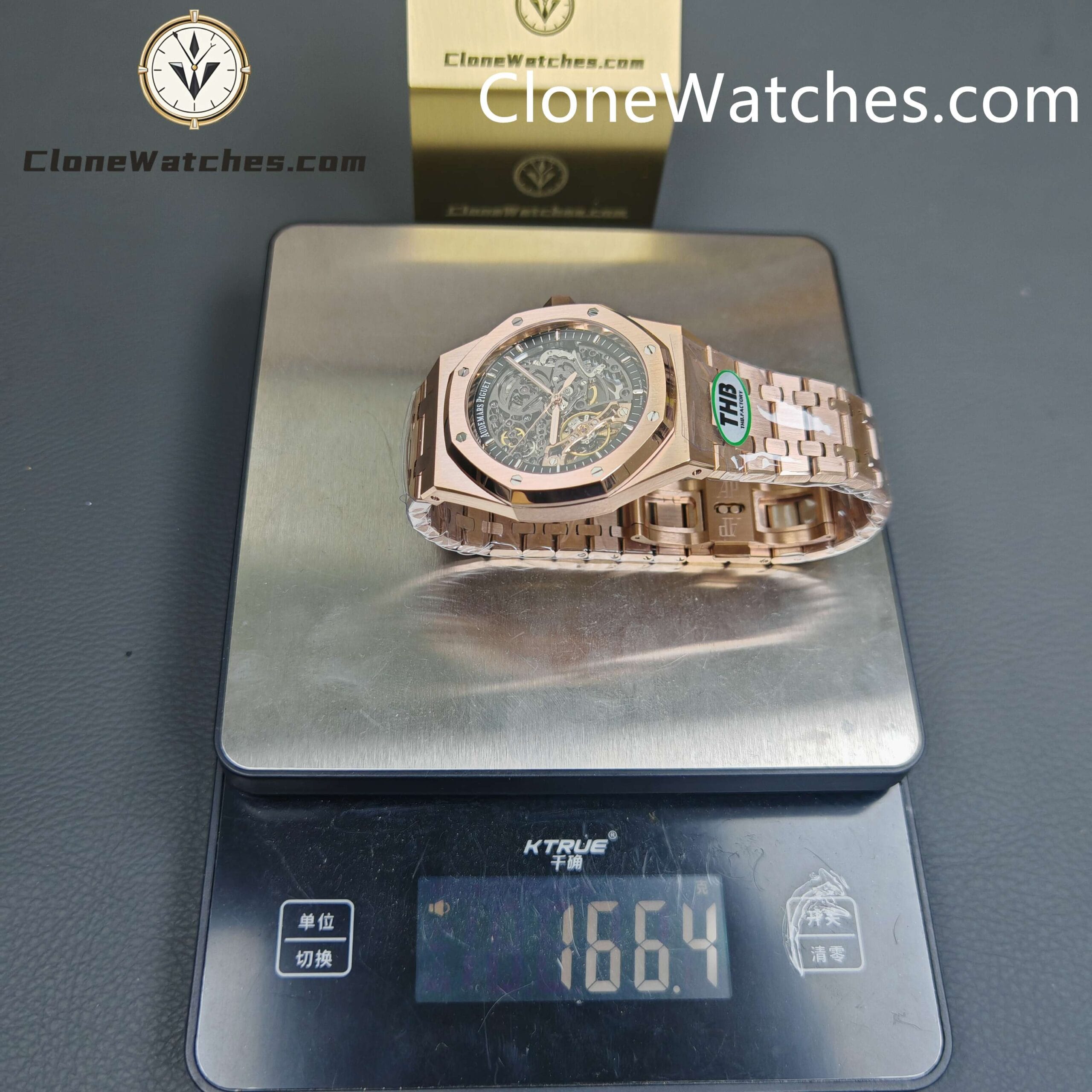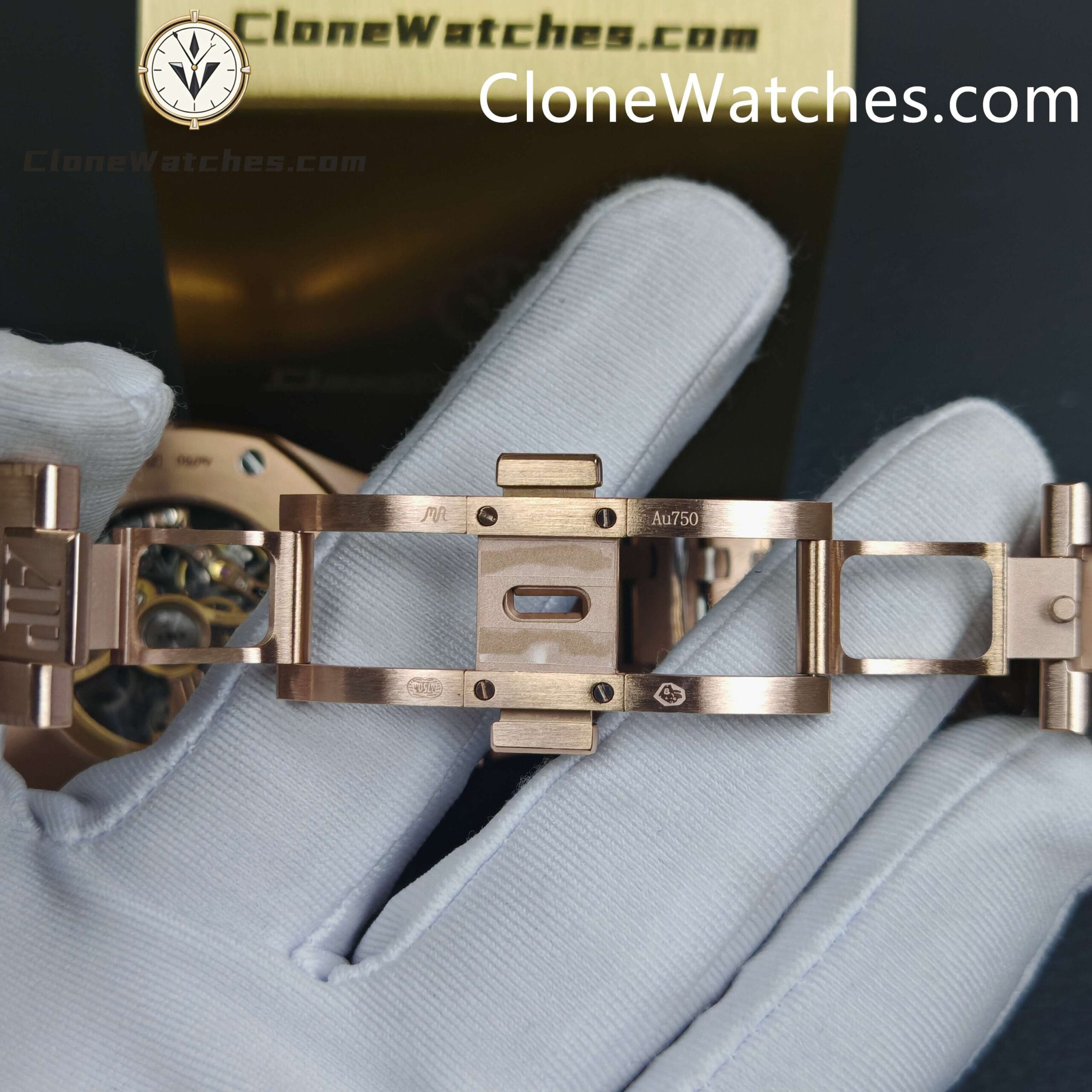 The dark gray dial features a round shape and hollow design, adding a refined element to the watch. The rose gold fluorescent three-dimensional hour markers and Royal Oak hands bring a luxurious touch. Clone Watches are protected by anti-glare sapphire crystal glass to ensure clarity and durability.
