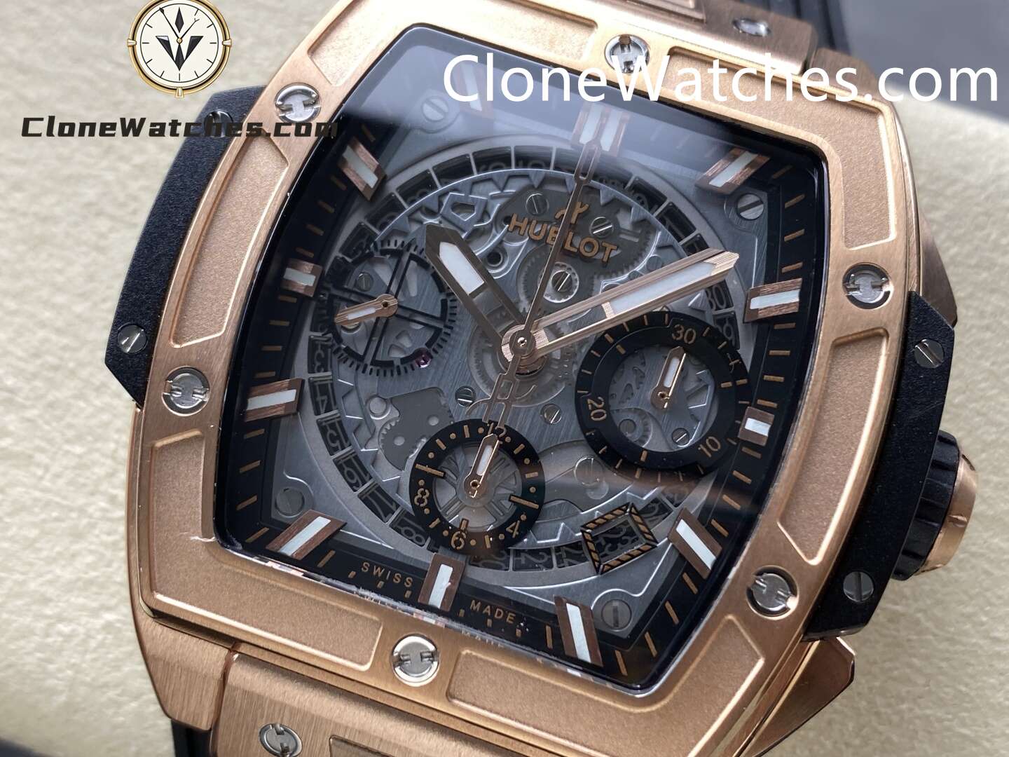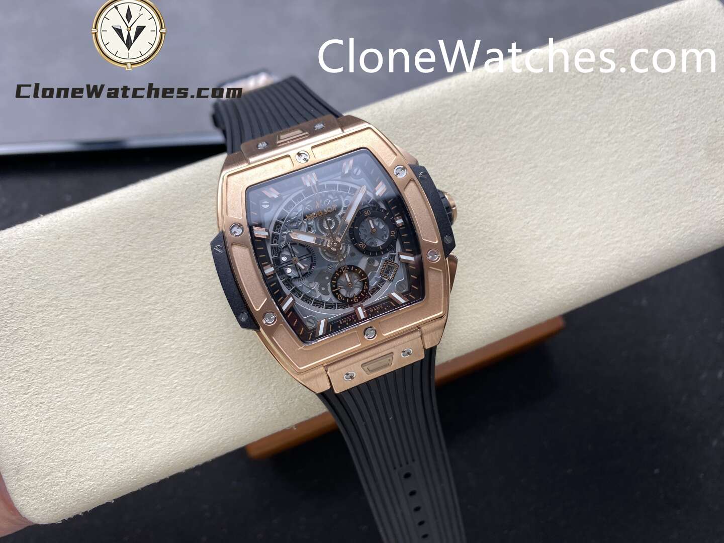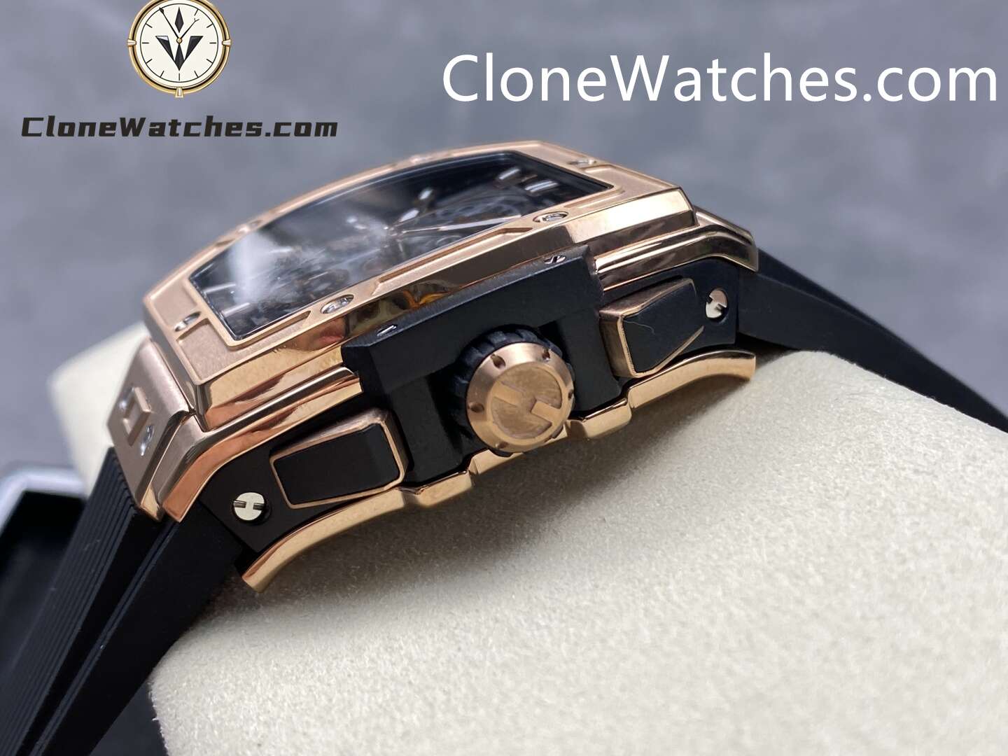 Hublot Spirit of Big Bang King Gold Super Clone Watches combines all the iconic features of the Spirit of Big Bang series with a new barrel-shaped case. The case is made of titanium (Rose gold plated) and resin material, and uses six H-shaped screws to build a “sandwich” structure to convey the concept of “integrated technology”. It is perfectly cloned with an exclusive customized HUB4700 movement, original folding clasp, and customized fluororubber strap. Clone Watches is equipped with a “one-button” quick-change strap system. The wearer can easily and quickly replace the strap with just a light press! ! !