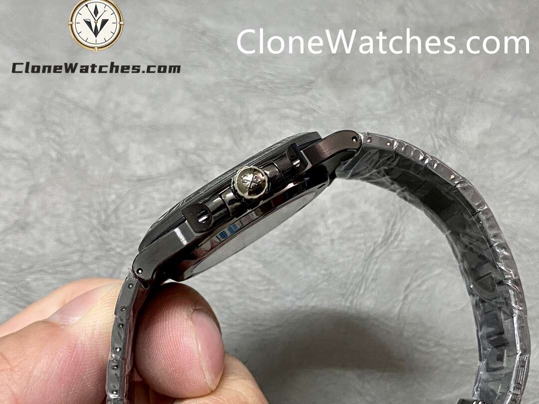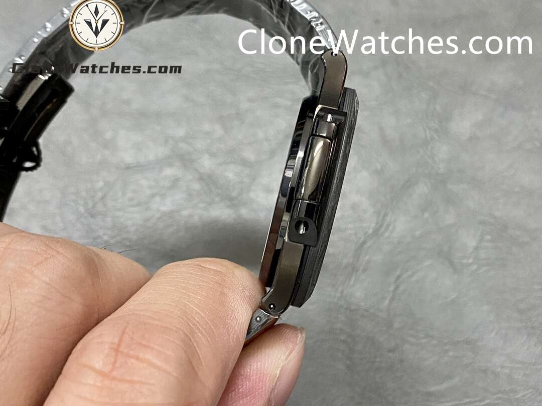 The back cover of the Clone Watches is made of stainless steel material with a black coating, and the visual look is very unified. The watch strap is particularly shocking, and is also made of a combination of carbon fiber and stainless steel. The texture of carbon fiber is like clouds and smoke, which makes people love it.