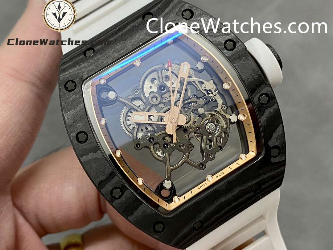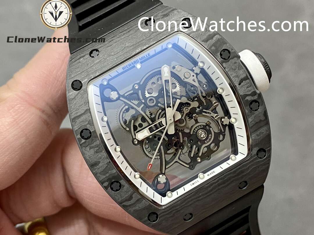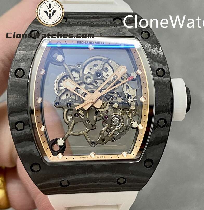 Richard Mille Super Clone Watches 1:1 RM 055 White Inner Bezel Carbon Tourbillon Black Strap