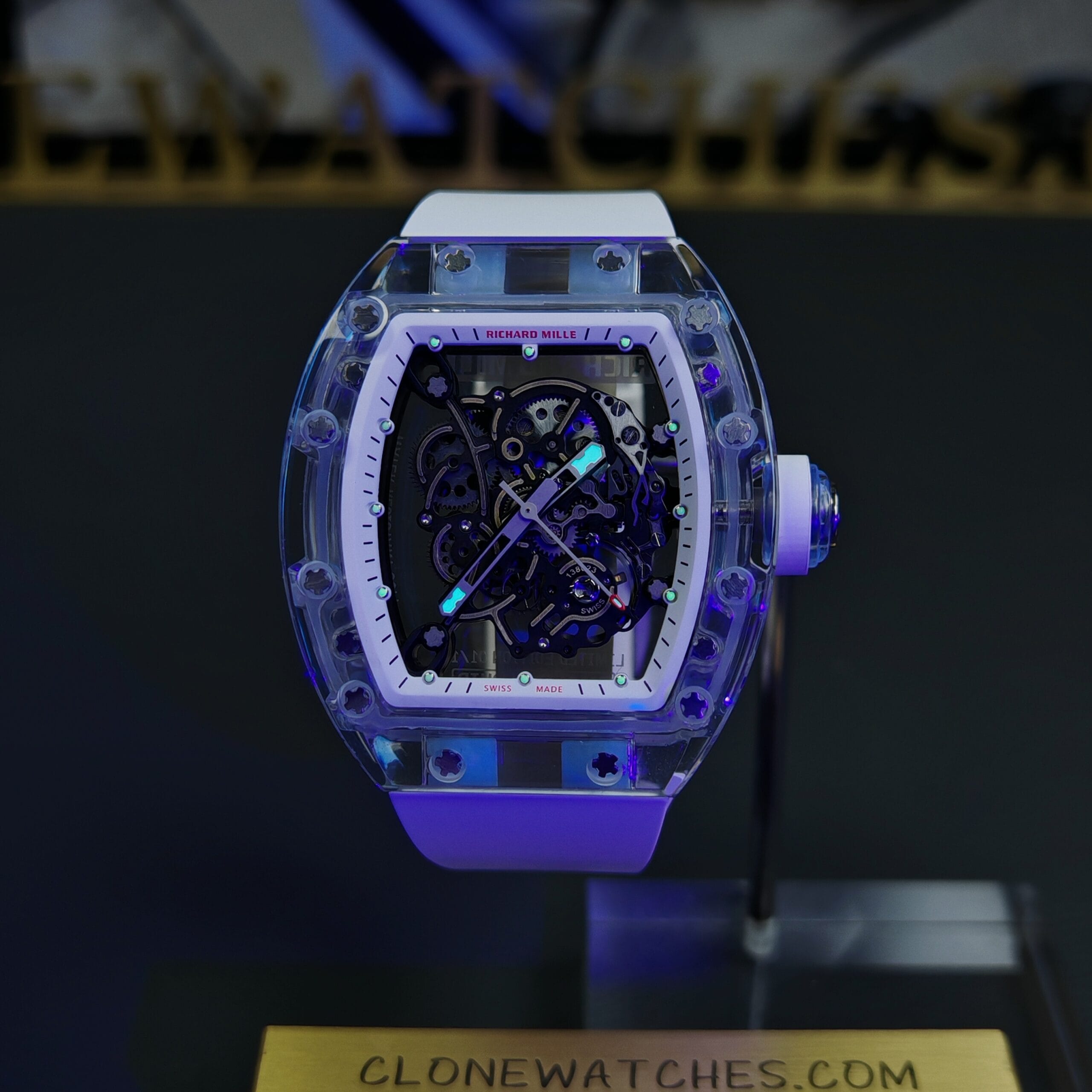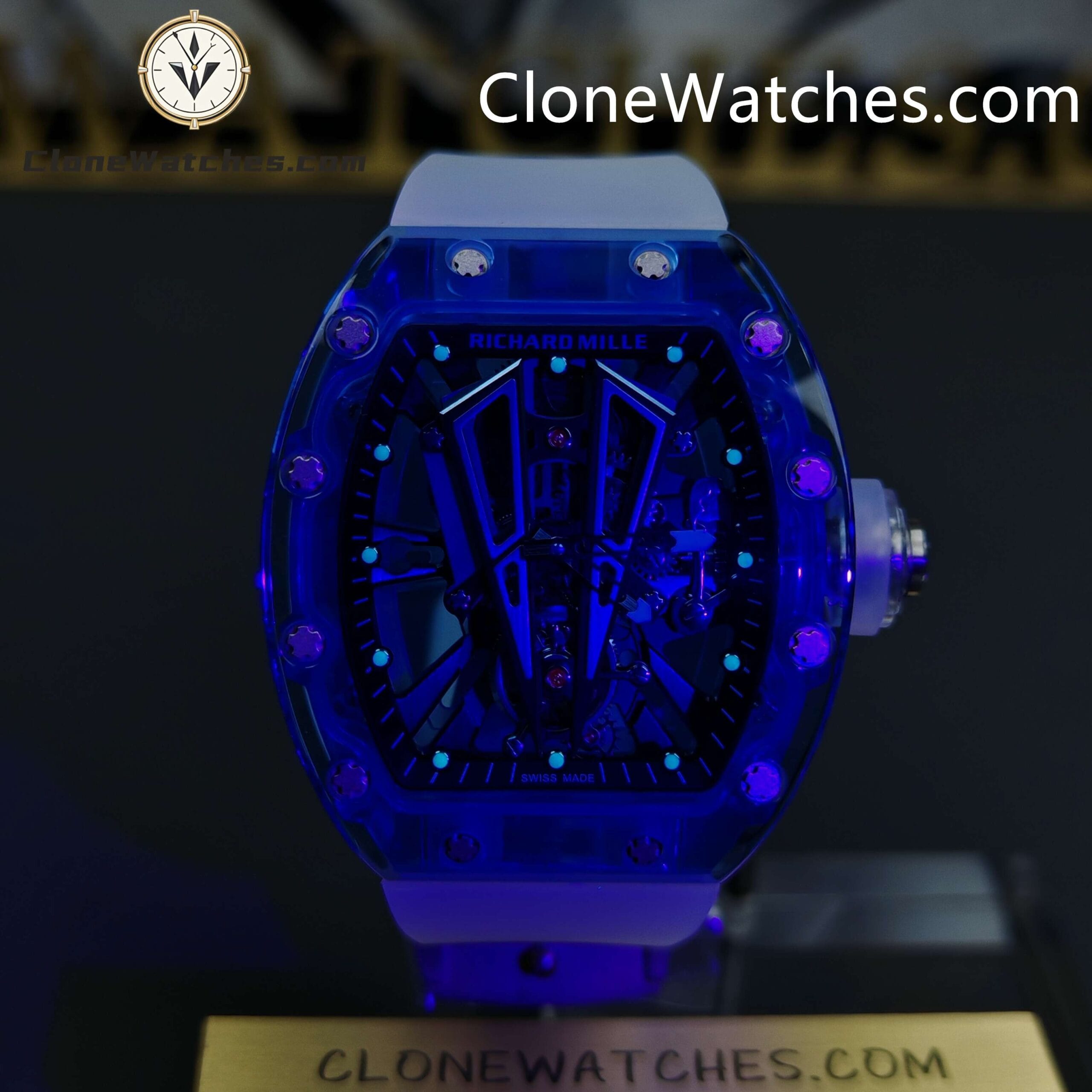 Richard Mille Super Clone Watches 1:1 RM 027 – 03 Blue Crystal Full Transparent Tourbillon White Strap