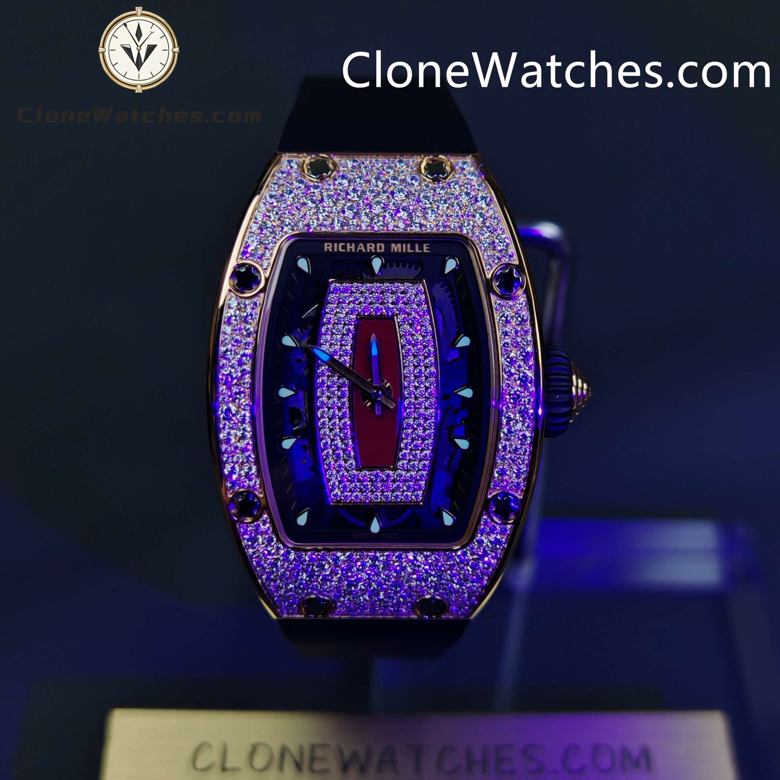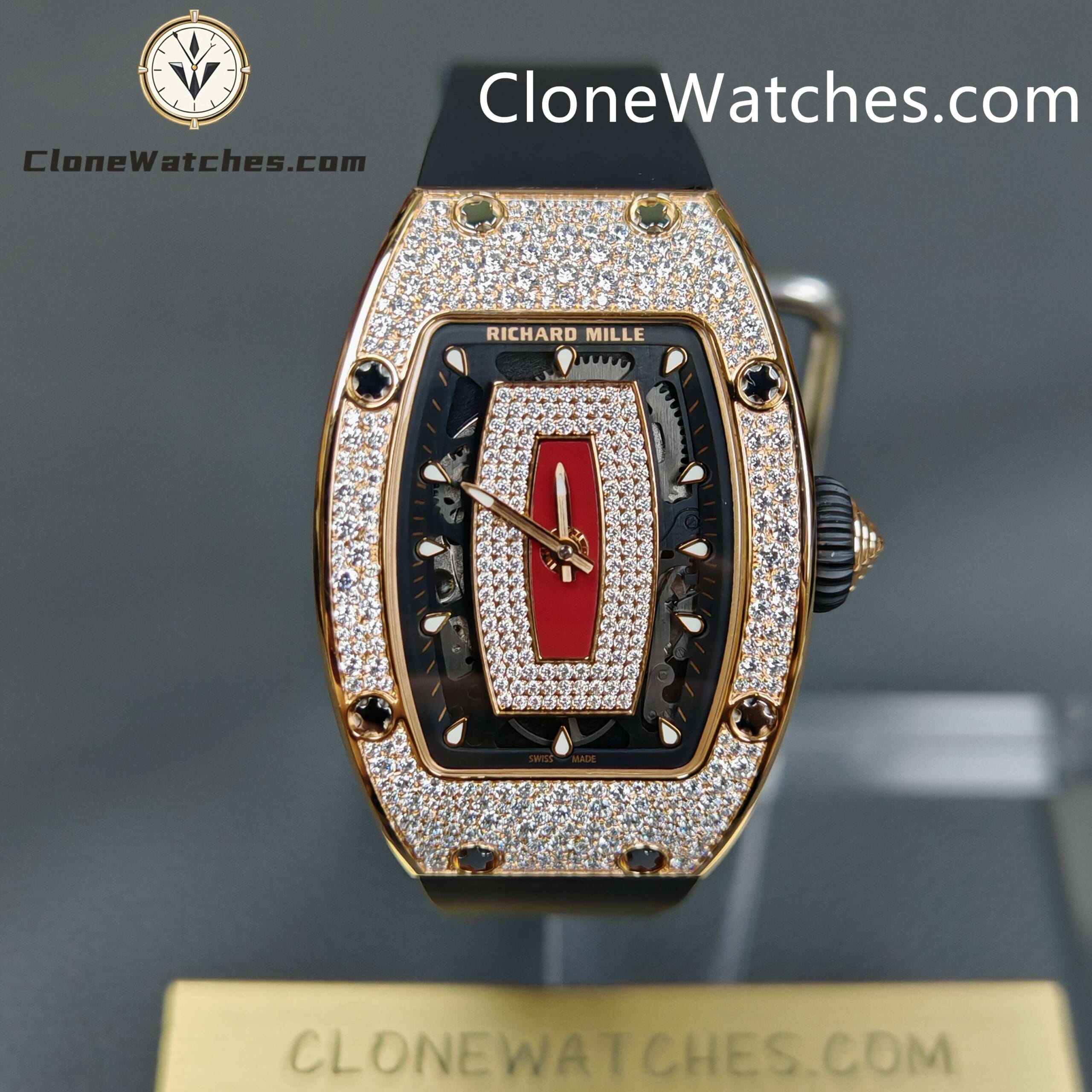Richard Mille Super clone watches 1:1 RM 007 Rose Gold Diamond dial Black strap