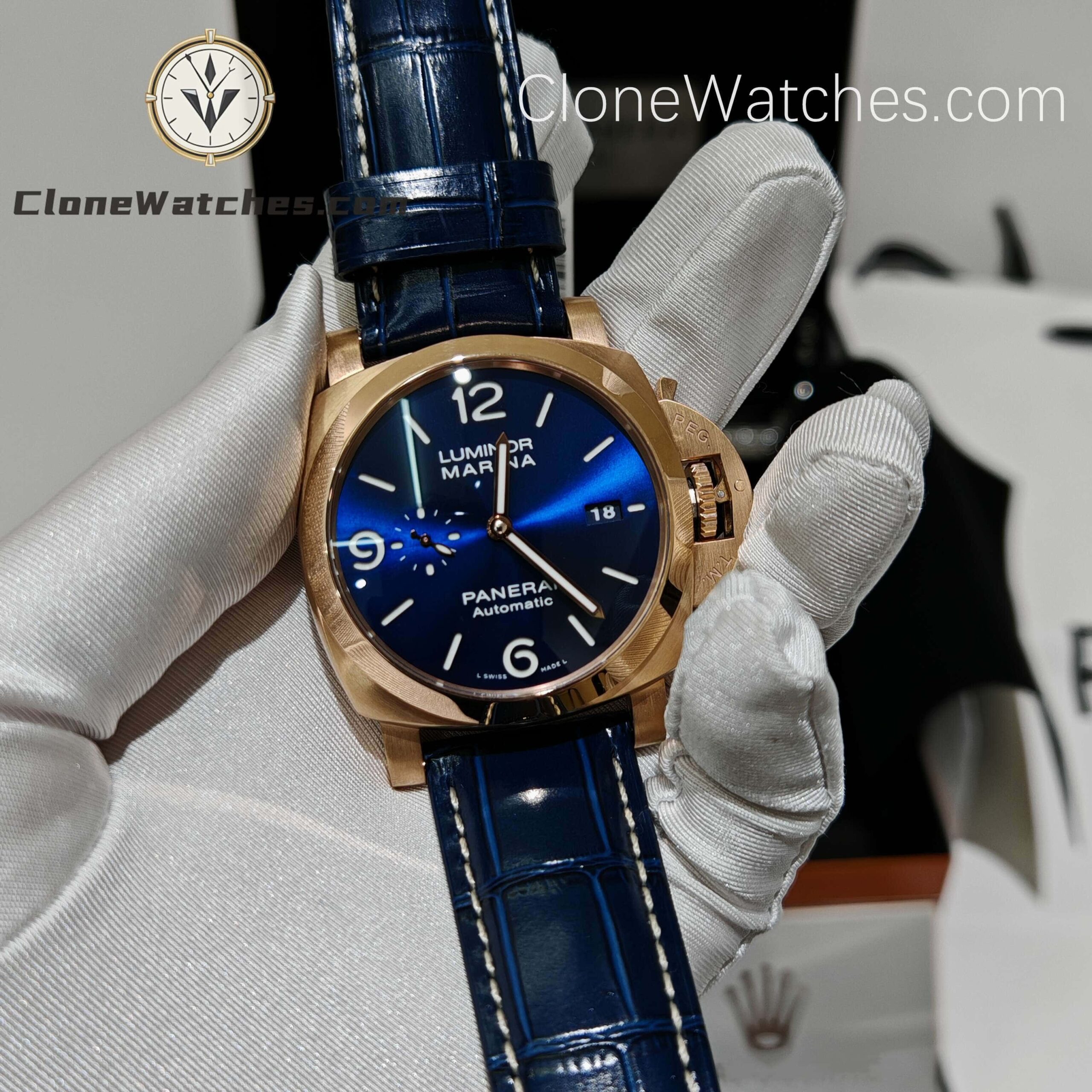 Panerai Super Clone Watches 1:1 18K Rose Gold Blue Dial Luminor Marina GoldtechTM PAM1112