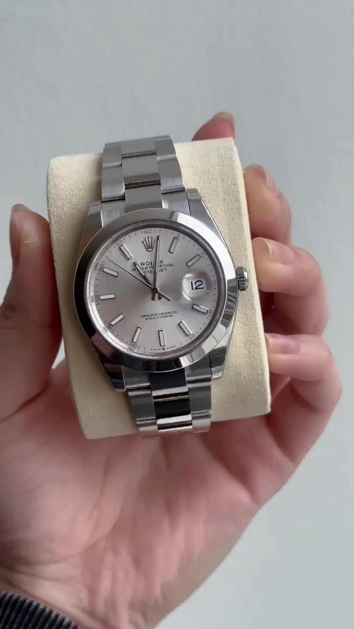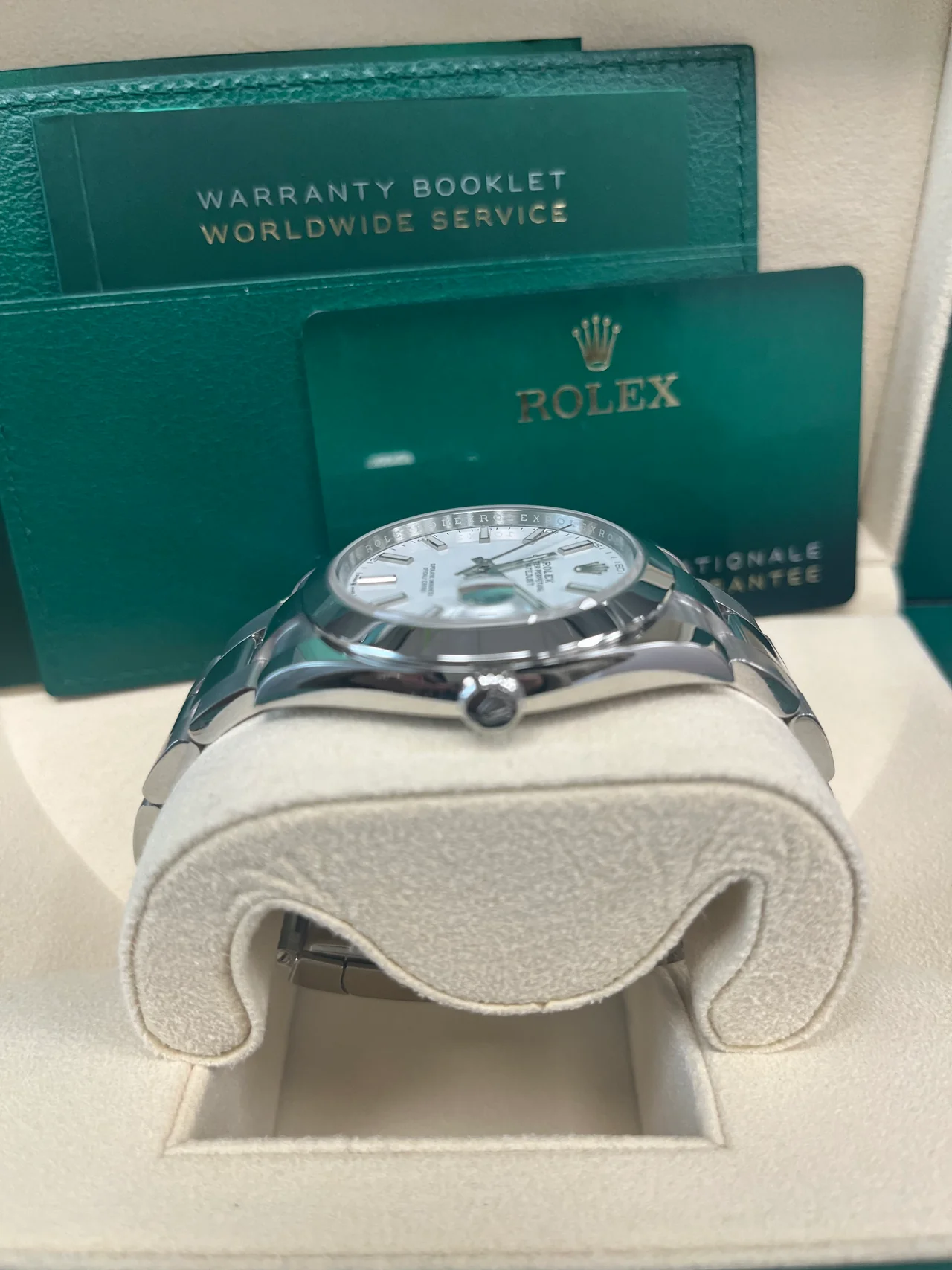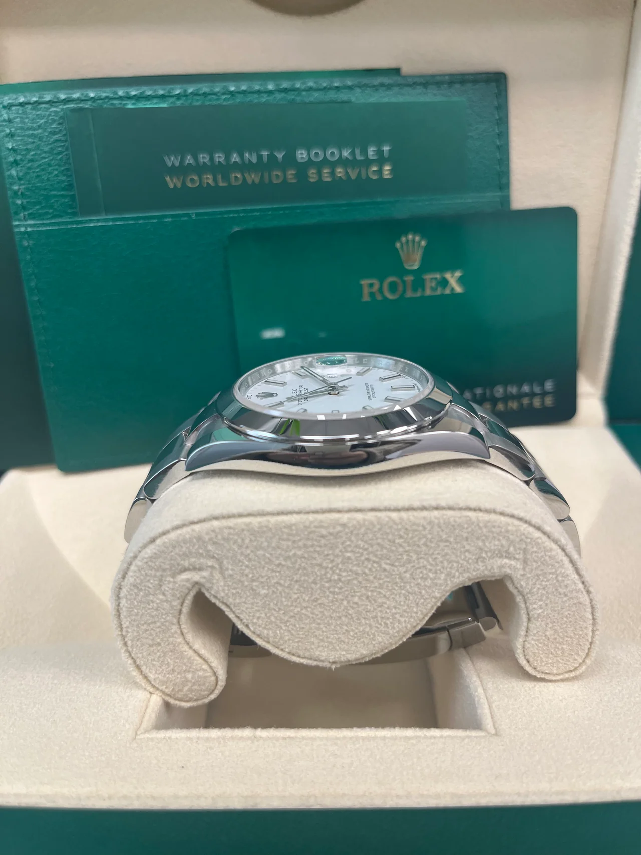 Luminescent Silver Hands and Stick Hour Markers with Minute Markers Around the Outer Rim and the Date at 3 o'clock on a White Dial.