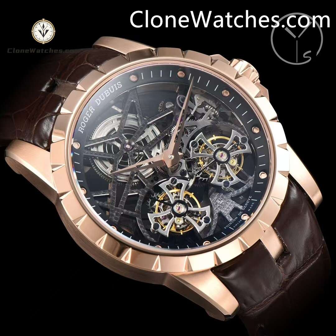 Roger Dubuis Super Clone Watches 1:1 Excalibur Rose Gold Skeleton Double Flying Tourbillon RDDBEX0395 45MM