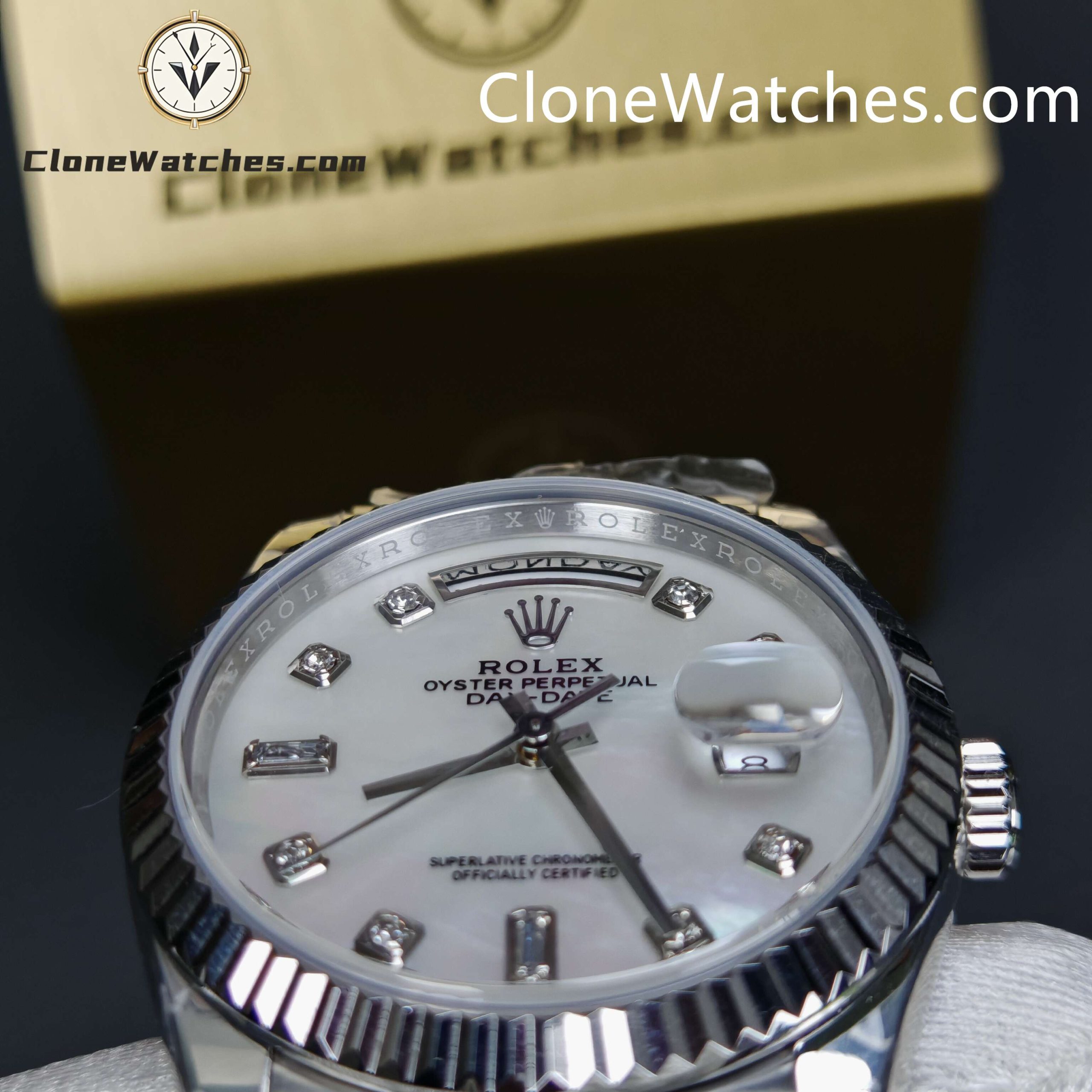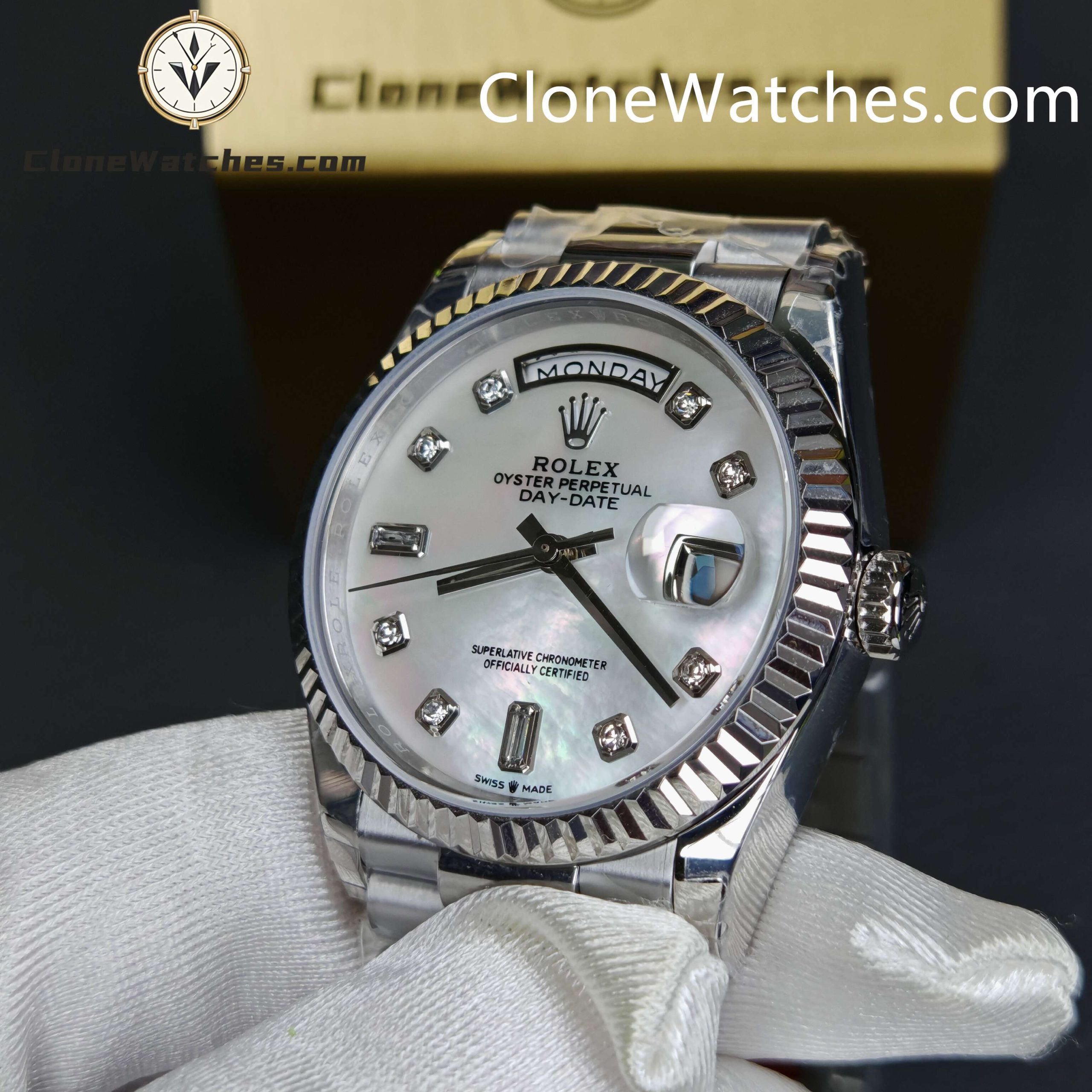 | Model | Rolex Super Clone Watches Day-Date Mother of Pearl Diamond Dial m128239 – 0007 |