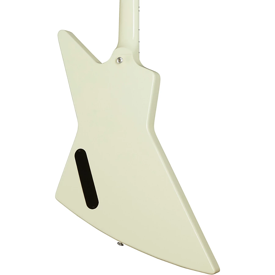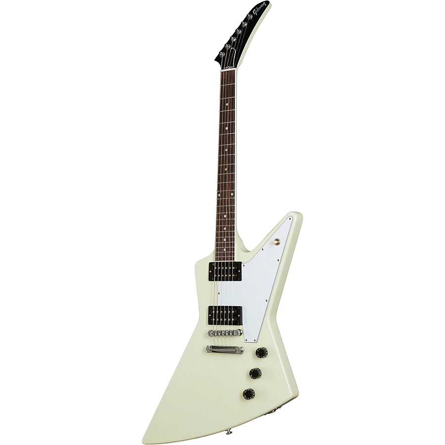 Gibson's iconic 70s Explorer electric guitar is back to inspire a new generation of players. The '70s Explorer features a pair of '70s Tribute Burstbucker pickups hand-wired with orange drop capacitors for warm, dynamic tone that begs to be played loud. Its classic white finish, bound rosewood fingerboard and black speed knobs provide fast playability and iconic 70s style.