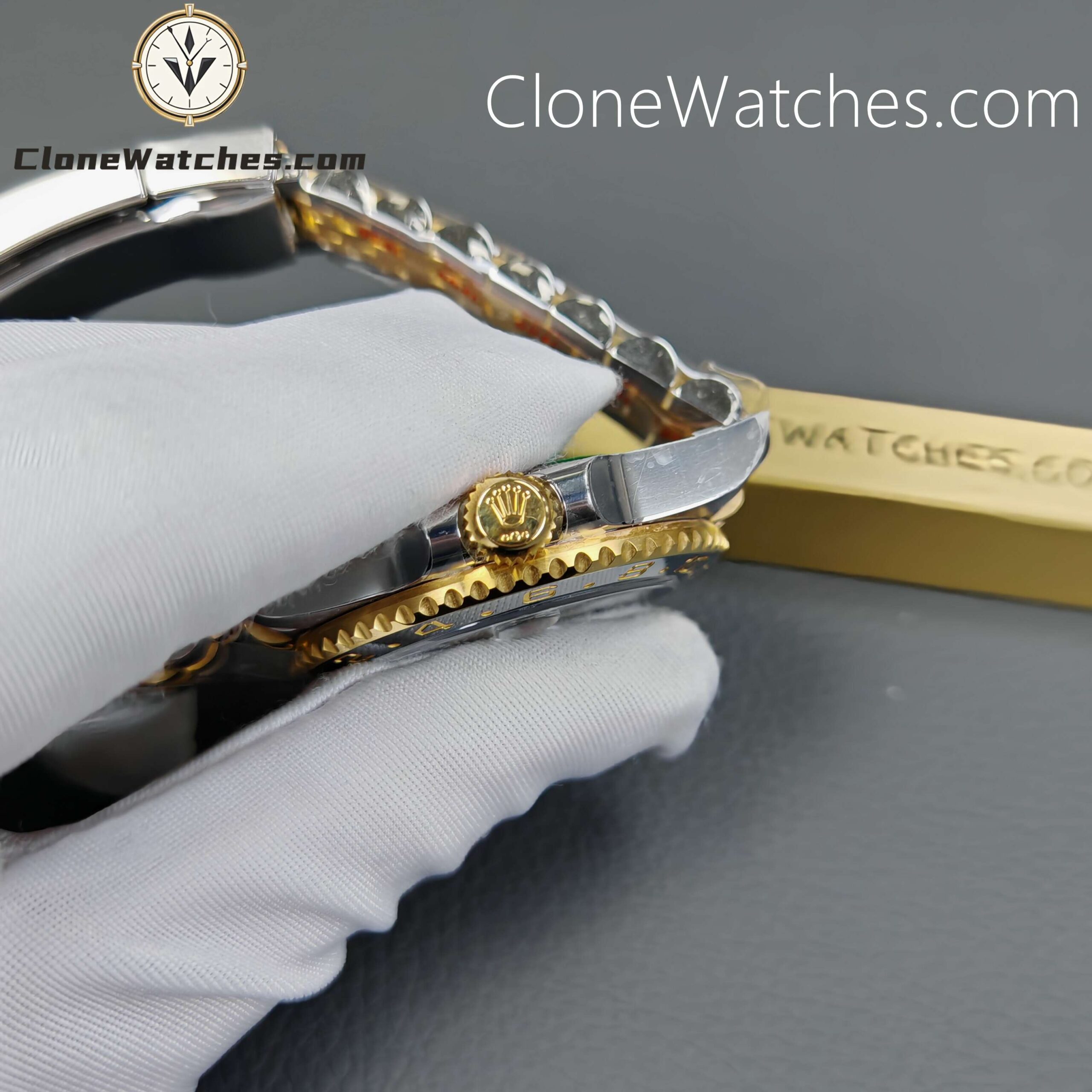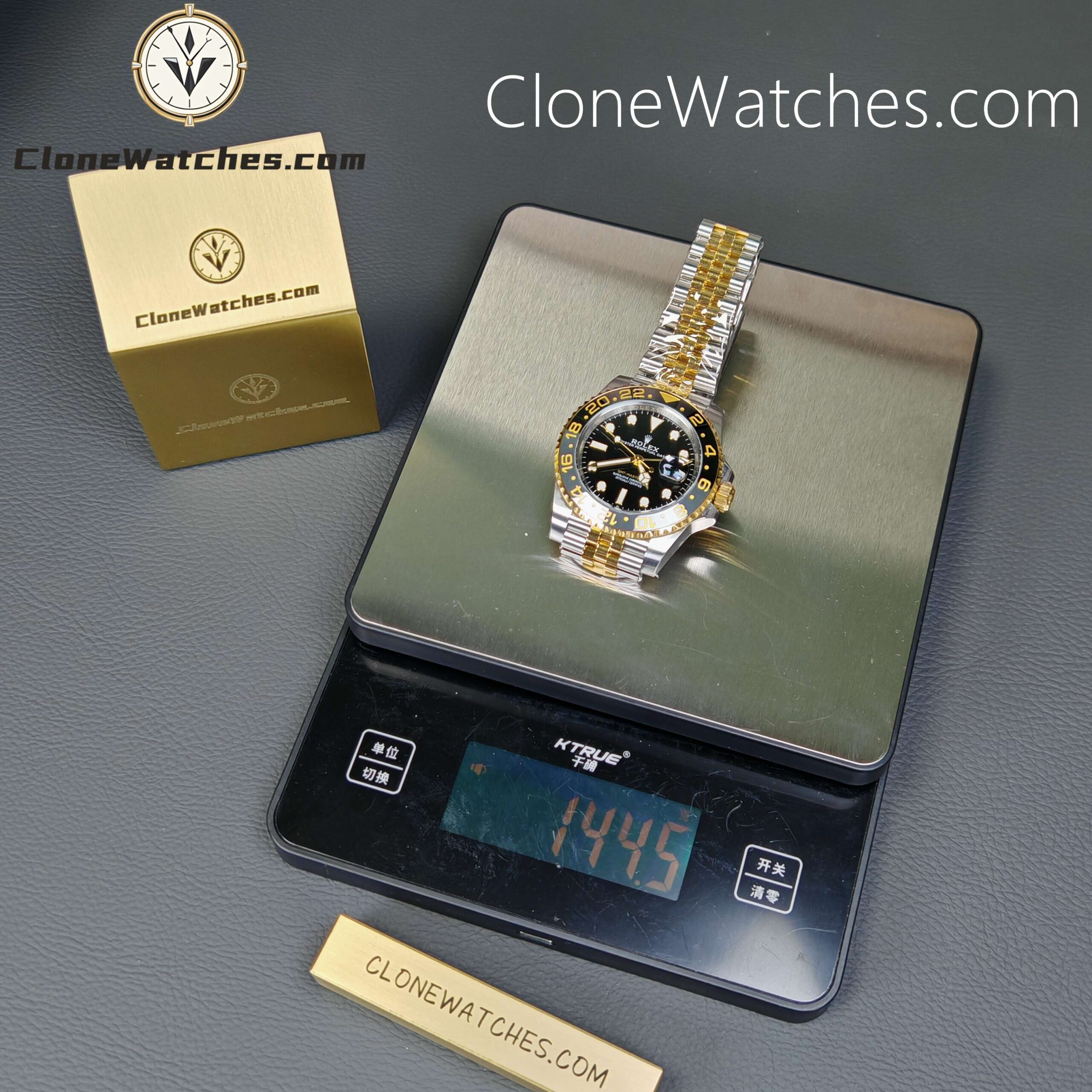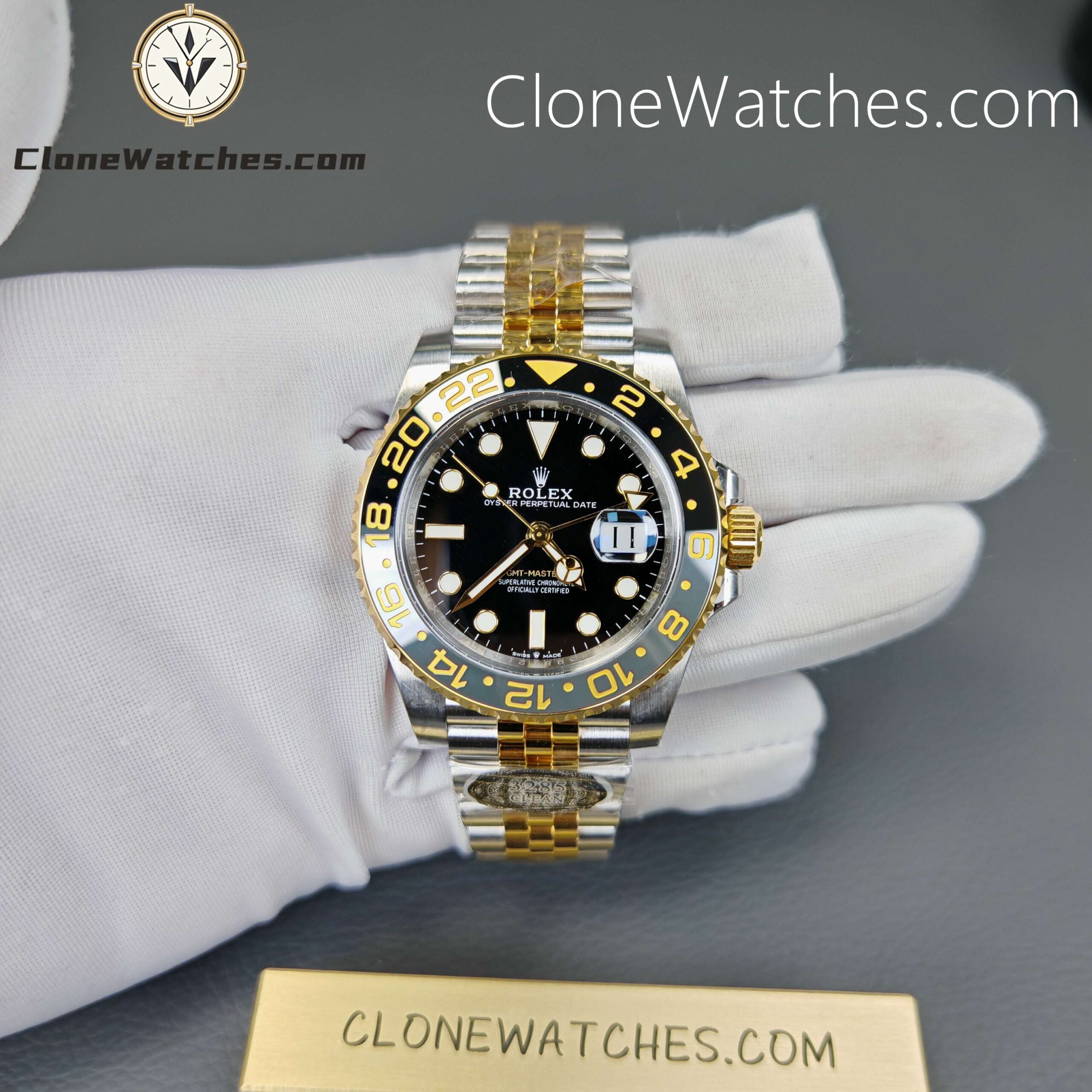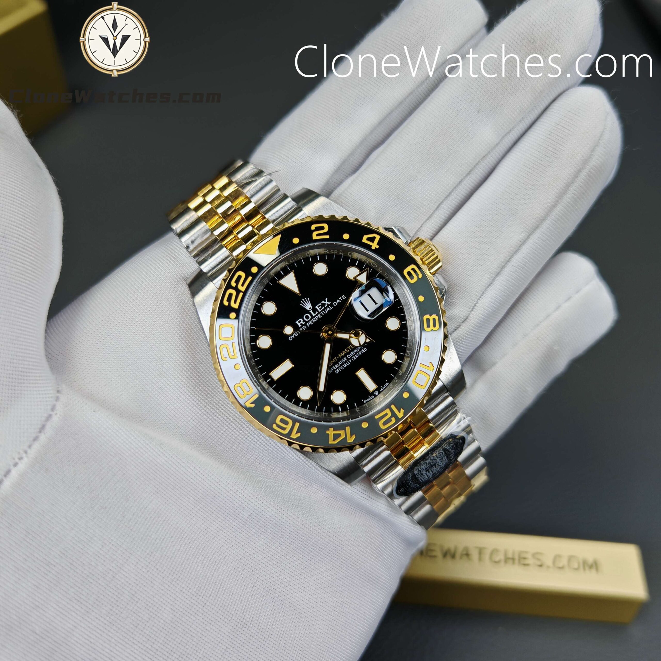 Rolex GMT Master II Super Clone Watches is made of consistent 904L stainless steel, showing precision and durability. The ceramic bezel is inlaid with platinum-coated numbers, which are seamlessly integrated to maintain the original design of the original watch.