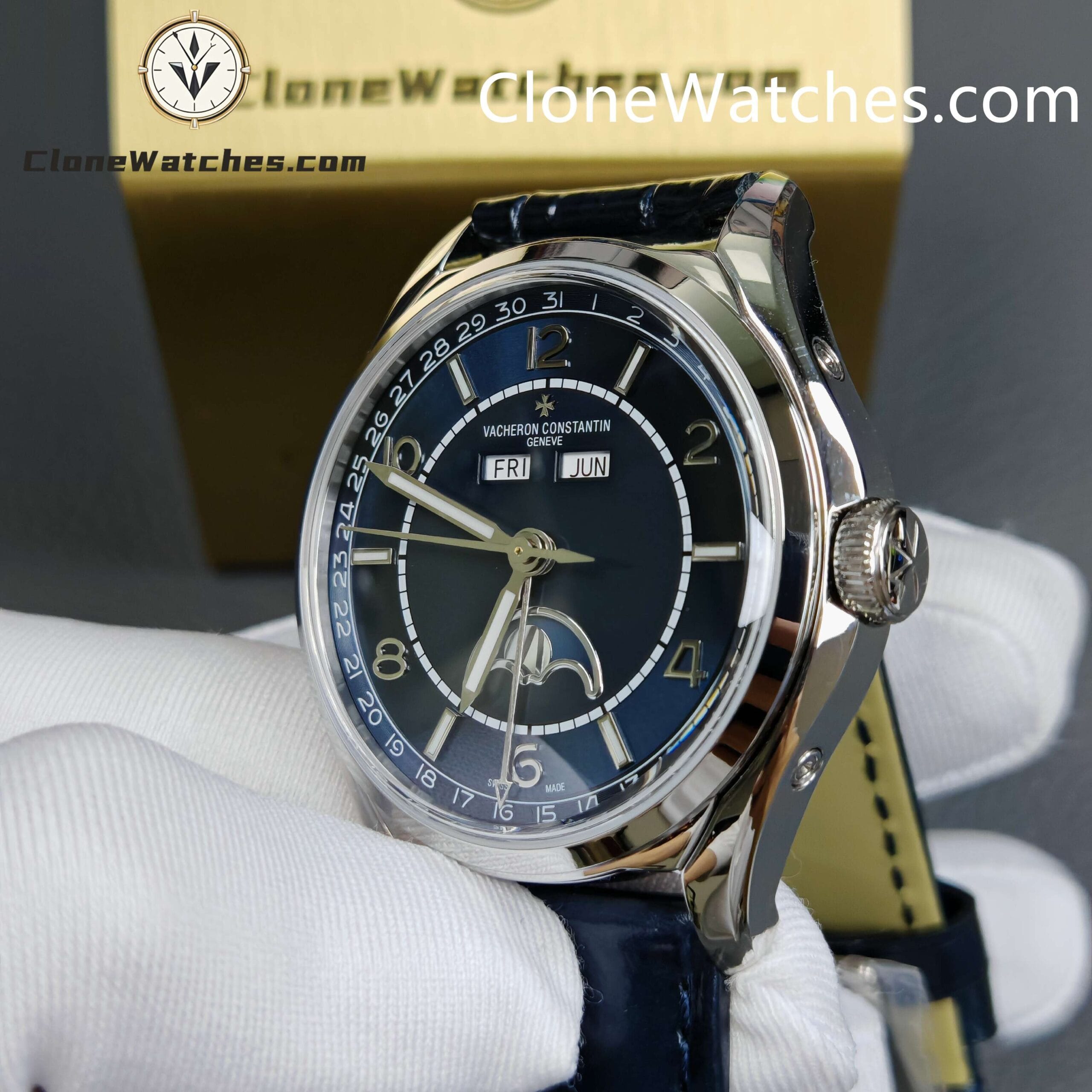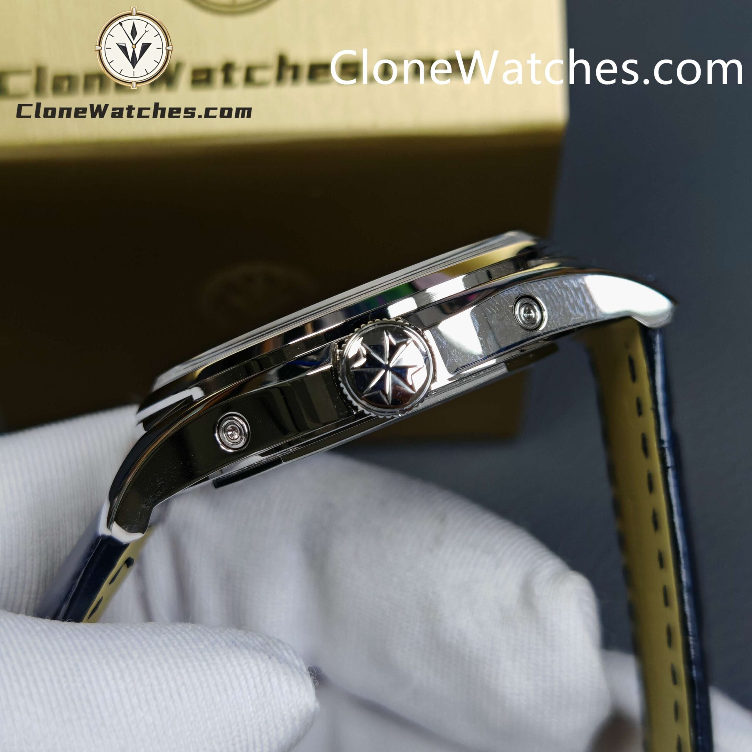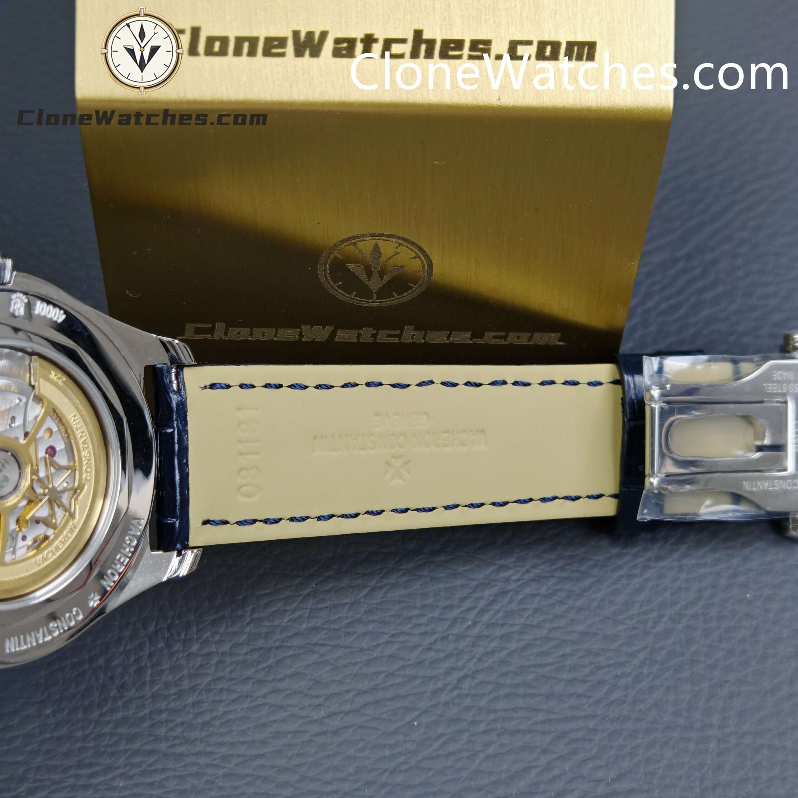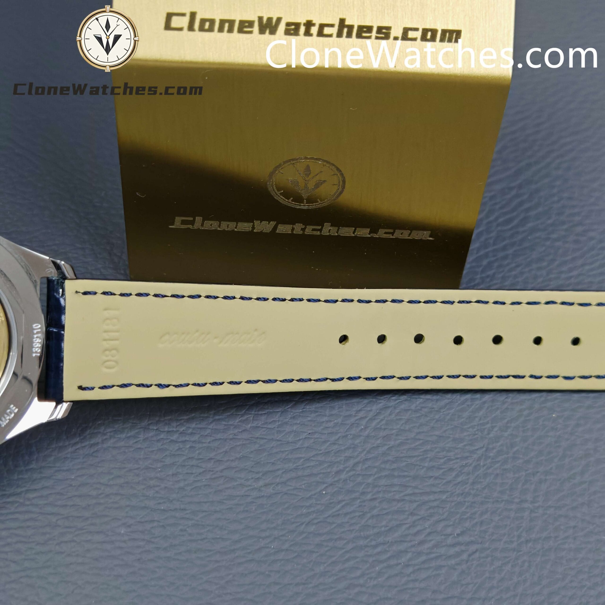 [Model] 4000E/000A-B548[Case] Clone Watches Size 40mm×11.6mm, truly synchronized with the original. The screw-in crown and the unique box-shaped sapphire crystal mirror improve wear resistance and durability while retaining the retro charm of Fiftysix.[Dial] Two rectangular windows at 12 o’clock can display the day of the week and the month respectively. The date display is located on the outer edge of the dial and is indicated by a blue pointer with an arrow. The moon phase display at 6 o’clock is composed of a blue night sky and a platinum moon. The scale ring is equipped with platinum Arabic numerals and bar-shaped hour markers, which complement the deep moon phase disk.[Movement] Striving for perfection at all costs, it took 18 months to develop a new 2460 Q/1 automatic winding movement, which perfectly corrected the shortcomings①The balance wheel position is consistent with the original