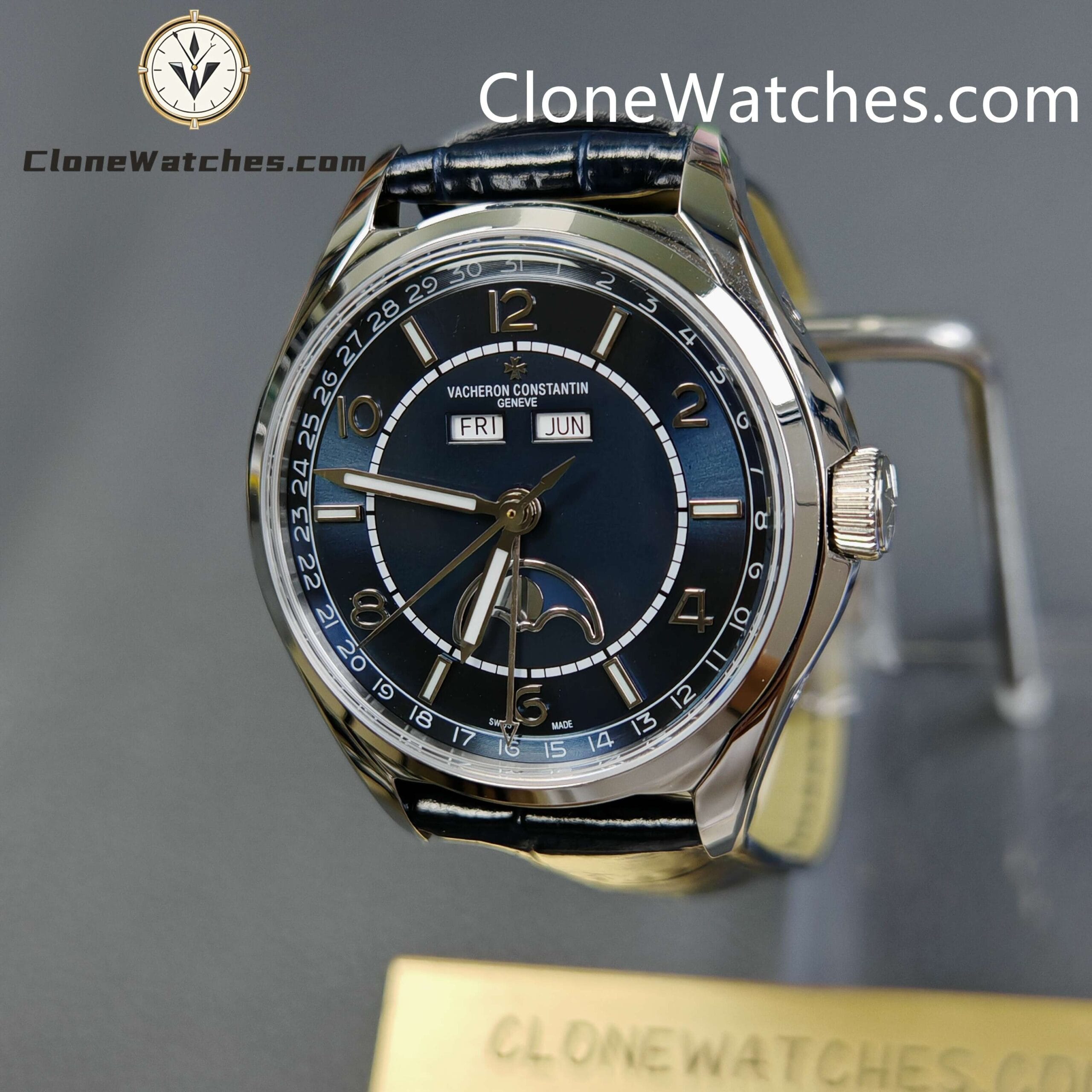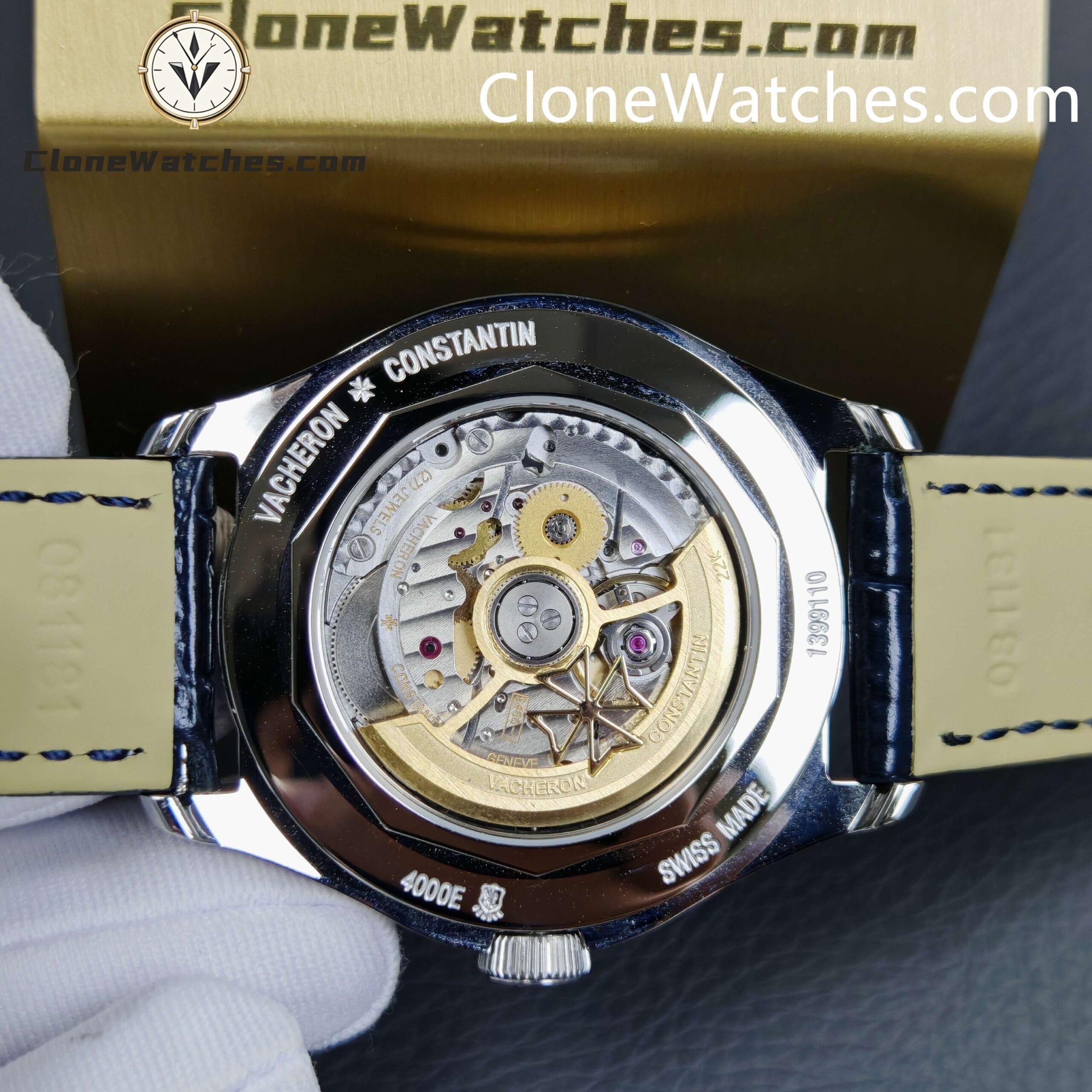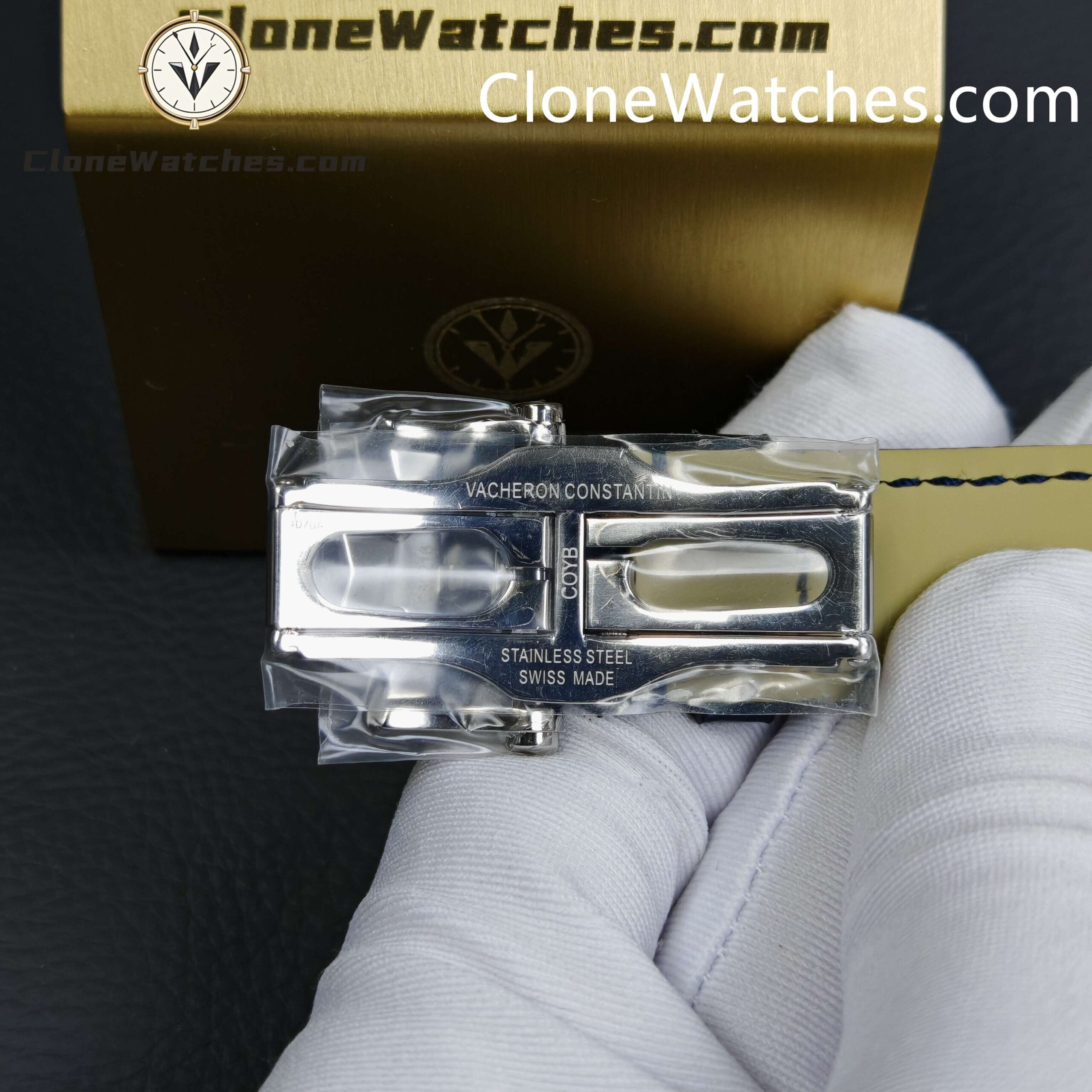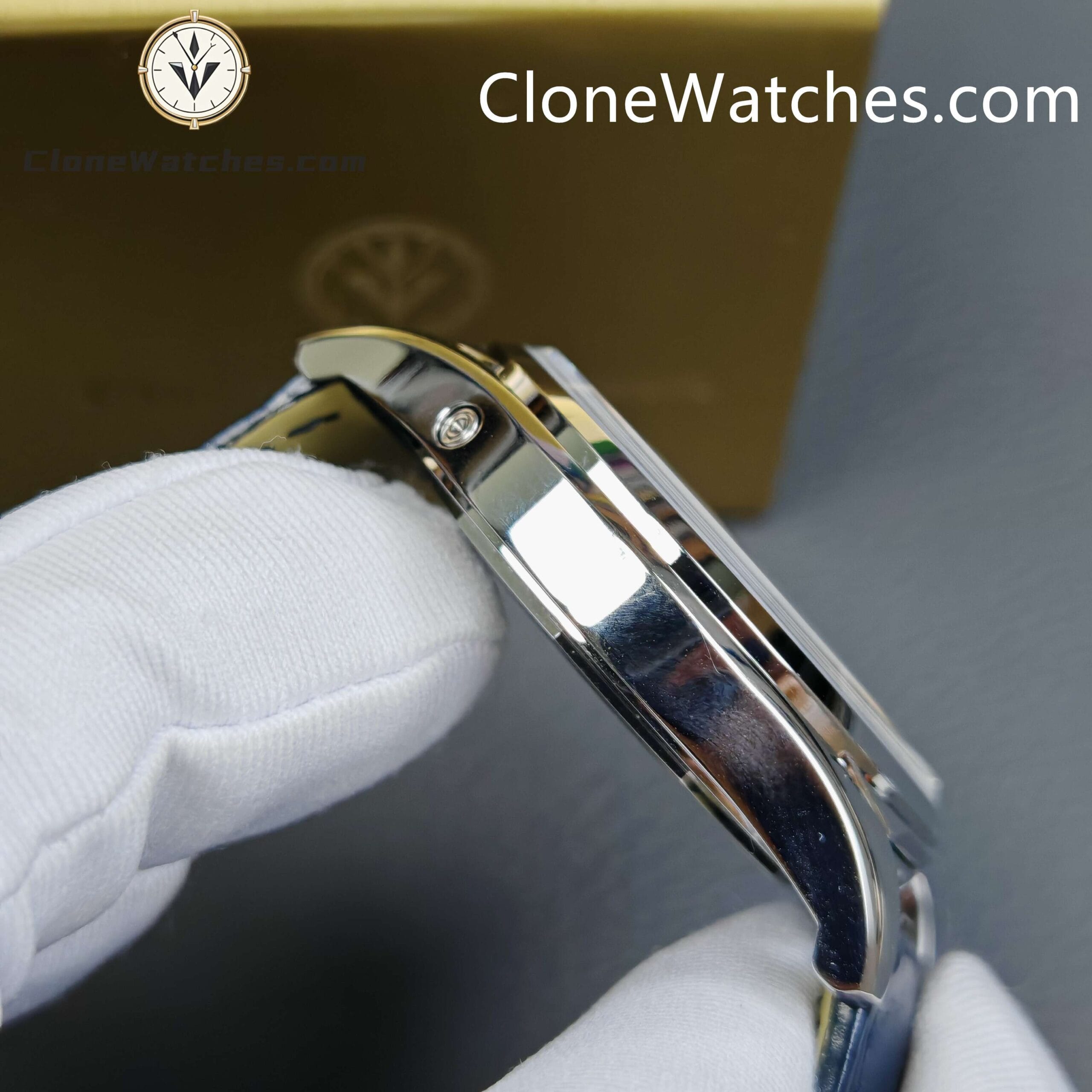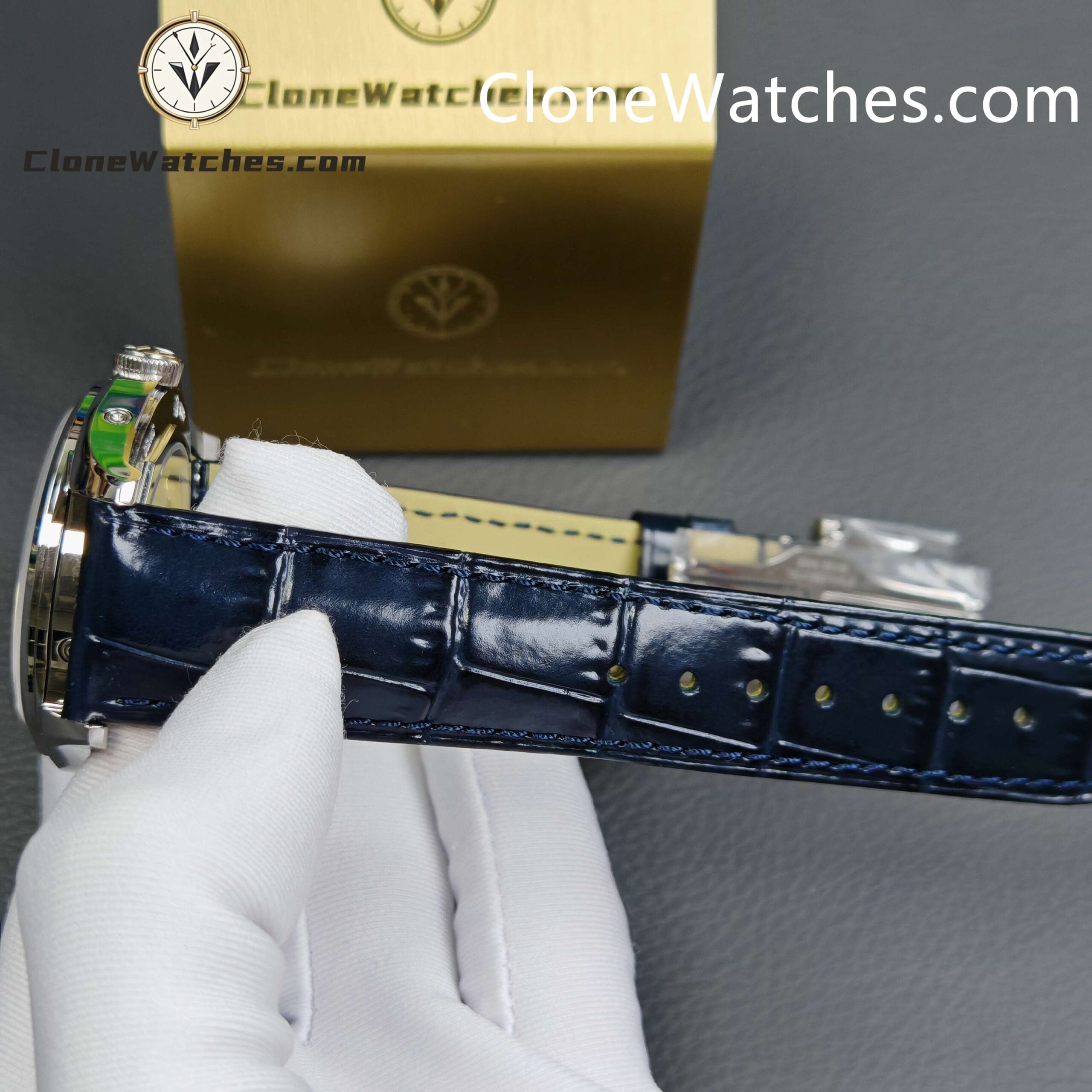 [Model] 4000E/000A-B548[Case] Clone Watches Size 40mm×11.6mm, truly synchronized with the original. The screw-in crown and the unique box-shaped sapphire crystal mirror improve wear resistance and durability while retaining the retro charm of Fiftysix.[Dial] Two rectangular windows at 12 o’clock can display the day of the week and the month respectively. The date display is located on the outer edge of the dial and is indicated by a blue pointer with an arrow. The moon phase display at 6 o’clock is composed of a blue night sky and a platinum moon. The scale ring is equipped with platinum Arabic numerals and bar-shaped hour markers, which complement the deep moon phase disk.[Movement] Striving for perfection at all costs, it took 18 months to develop a new 2460 Q/1 automatic winding movement, which perfectly corrected the shortcomings①The balance wheel position is consistent with the original