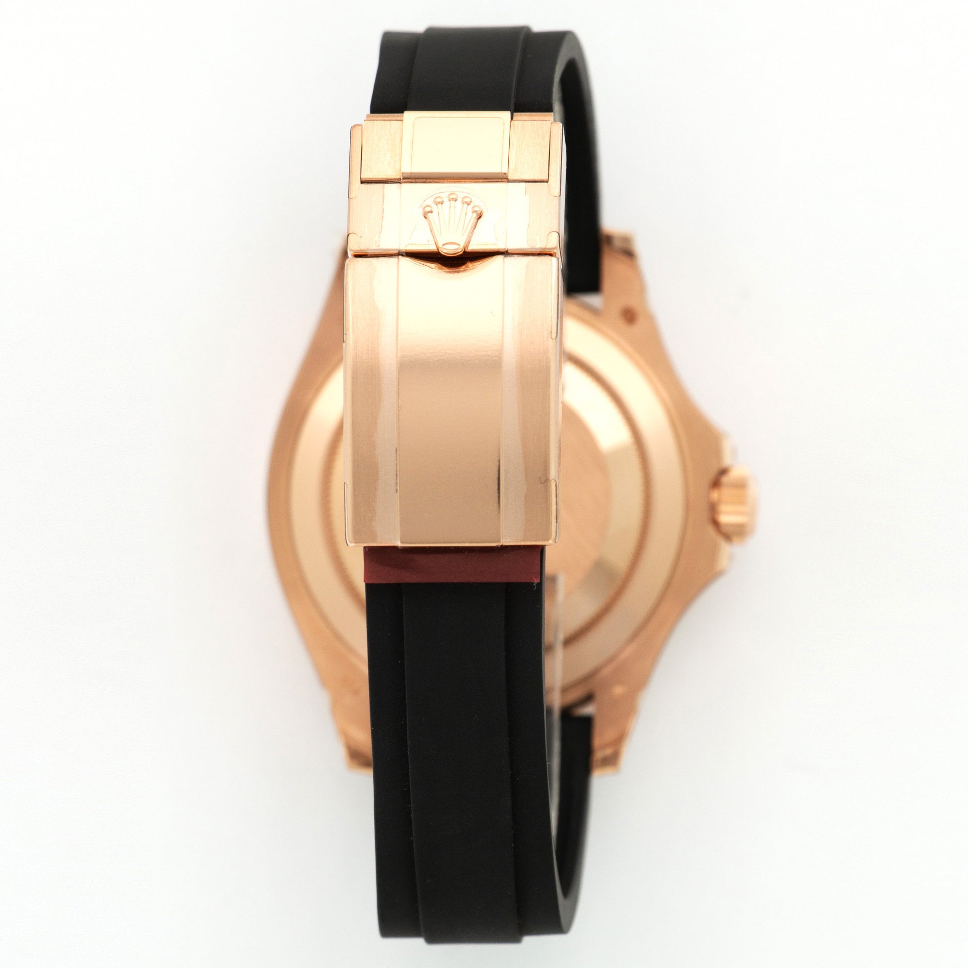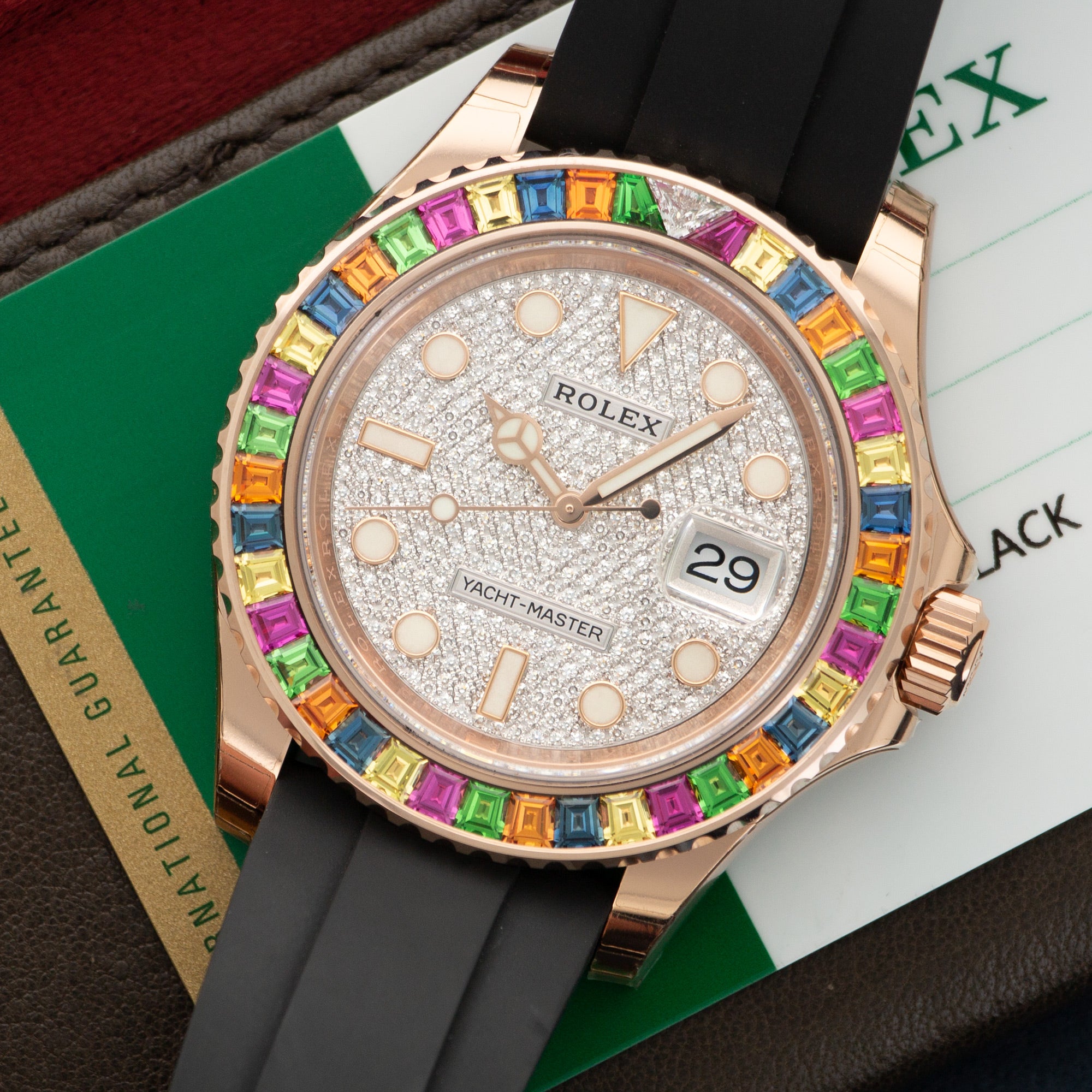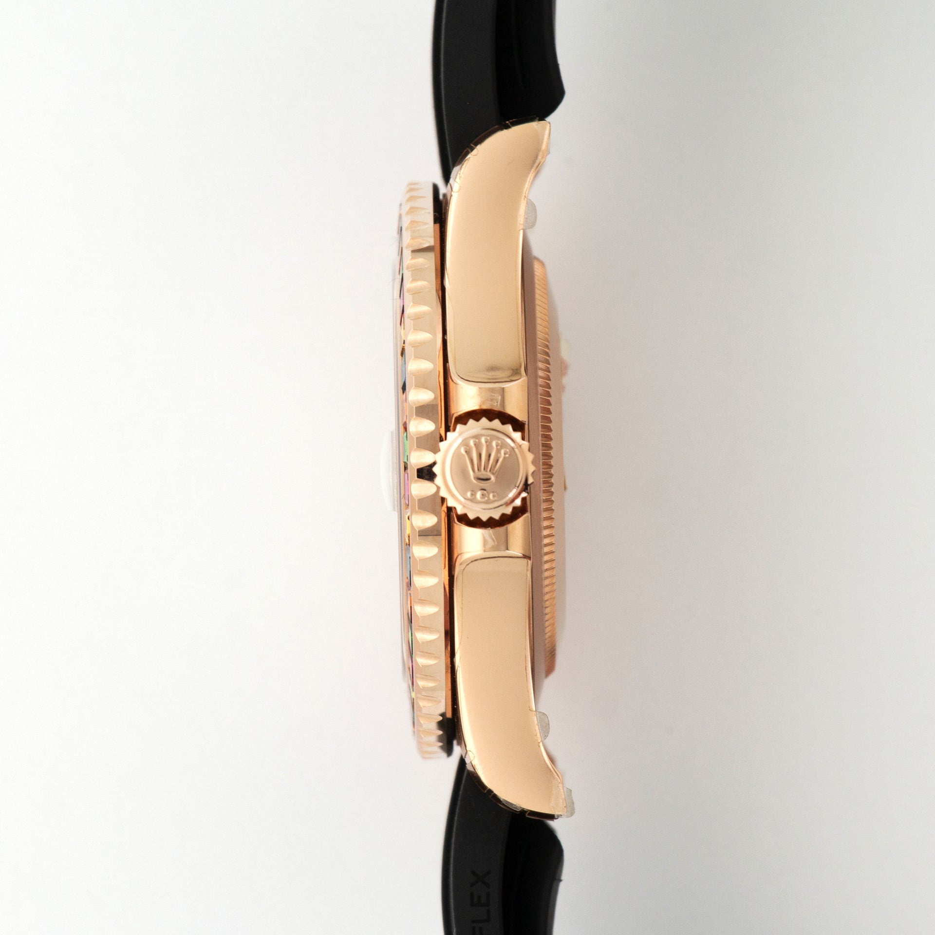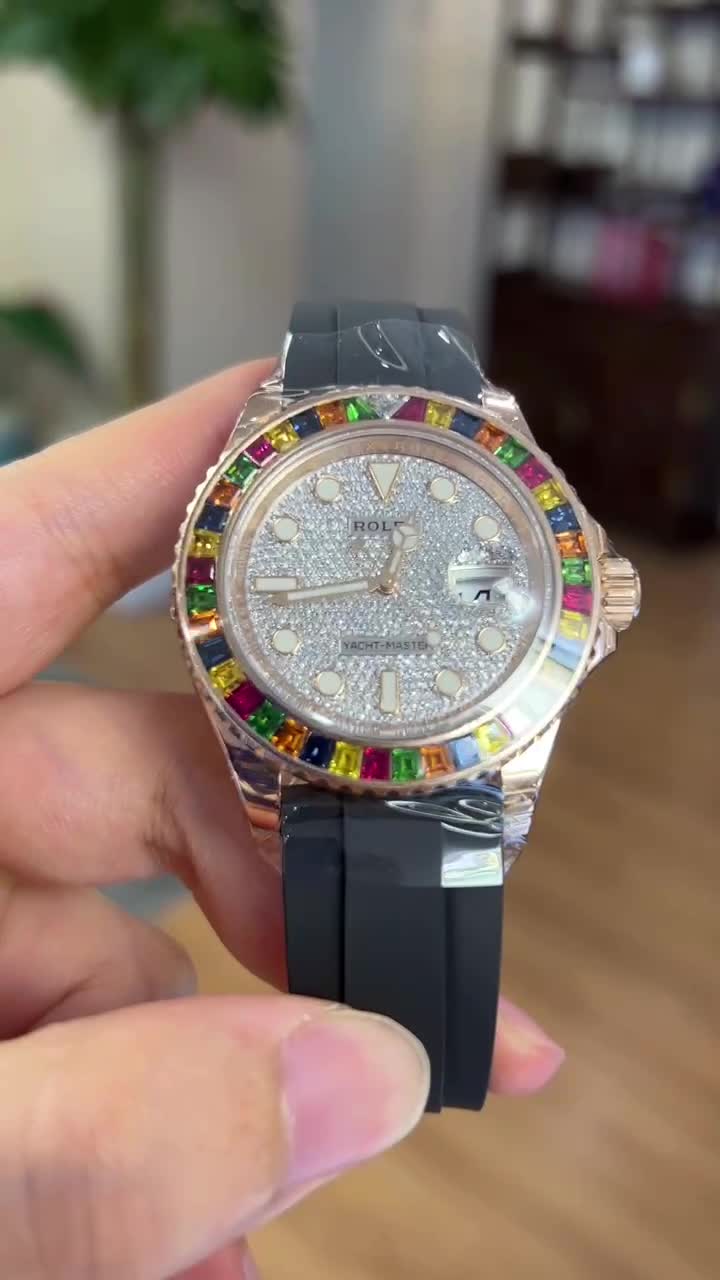 18kt rose gold case with a rubber oysterflex strap. Rainbow sapphire diamond set bezel. Diamond set dial with diamond hour markers. Dial Type: Analog. Date display at the 3 o'clock position. Rolex Calibre 3135 automatic movement with a 48-hour power reserve. Scratch resistant sapphire crystal. Screw down crown. Solid case back. Round case shape. Case size: 40 mm. Oysterlock clasp. Water resistant at 100 meters / 330 feet. Functions: date, hour, minute, second, chronometer. Dress watch style. Watch label: Swiss Made.